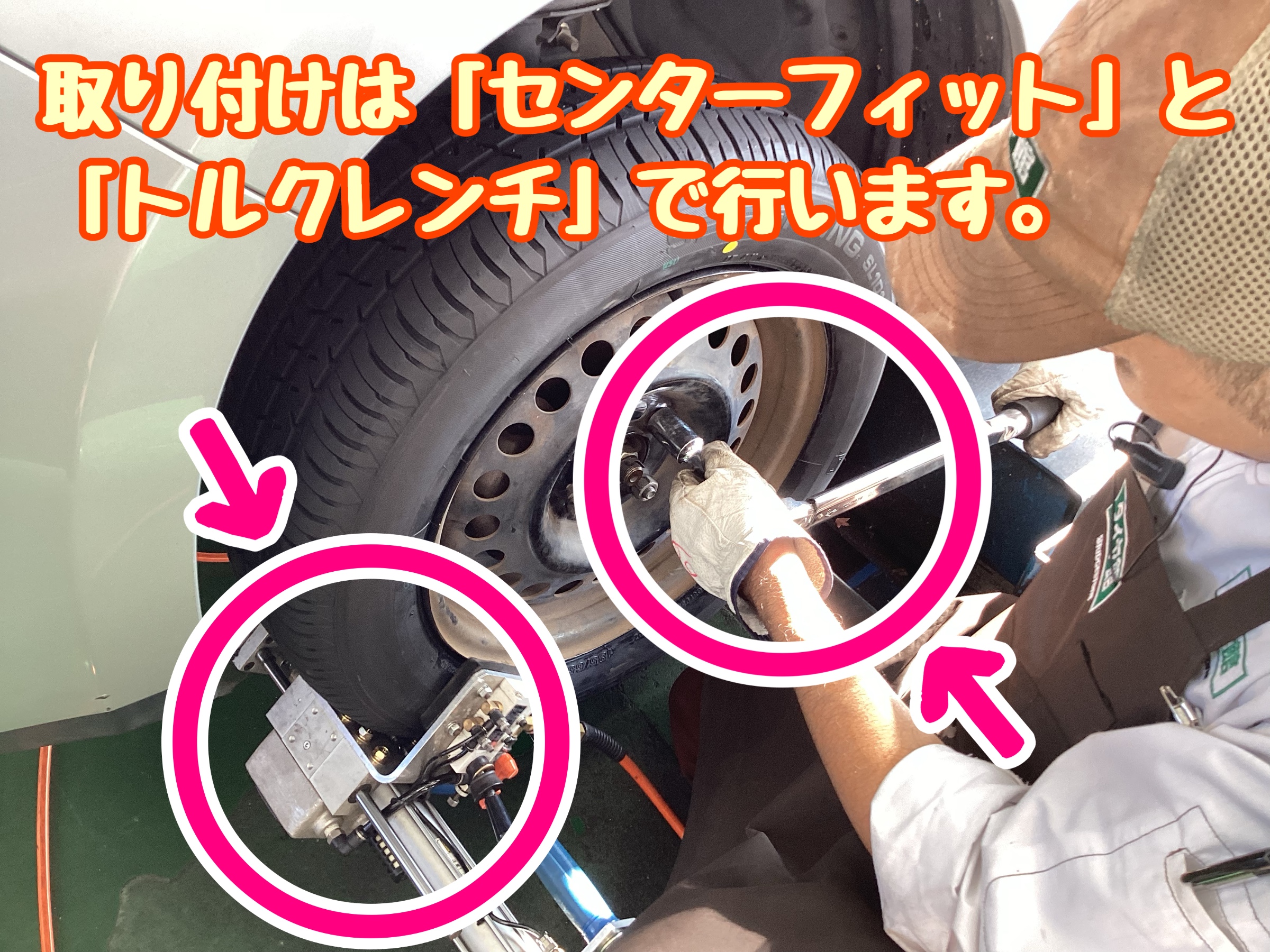 タイヤを組んだ後、メーカー指定の空気圧に調整し、タイヤの回転バランスを調整します。