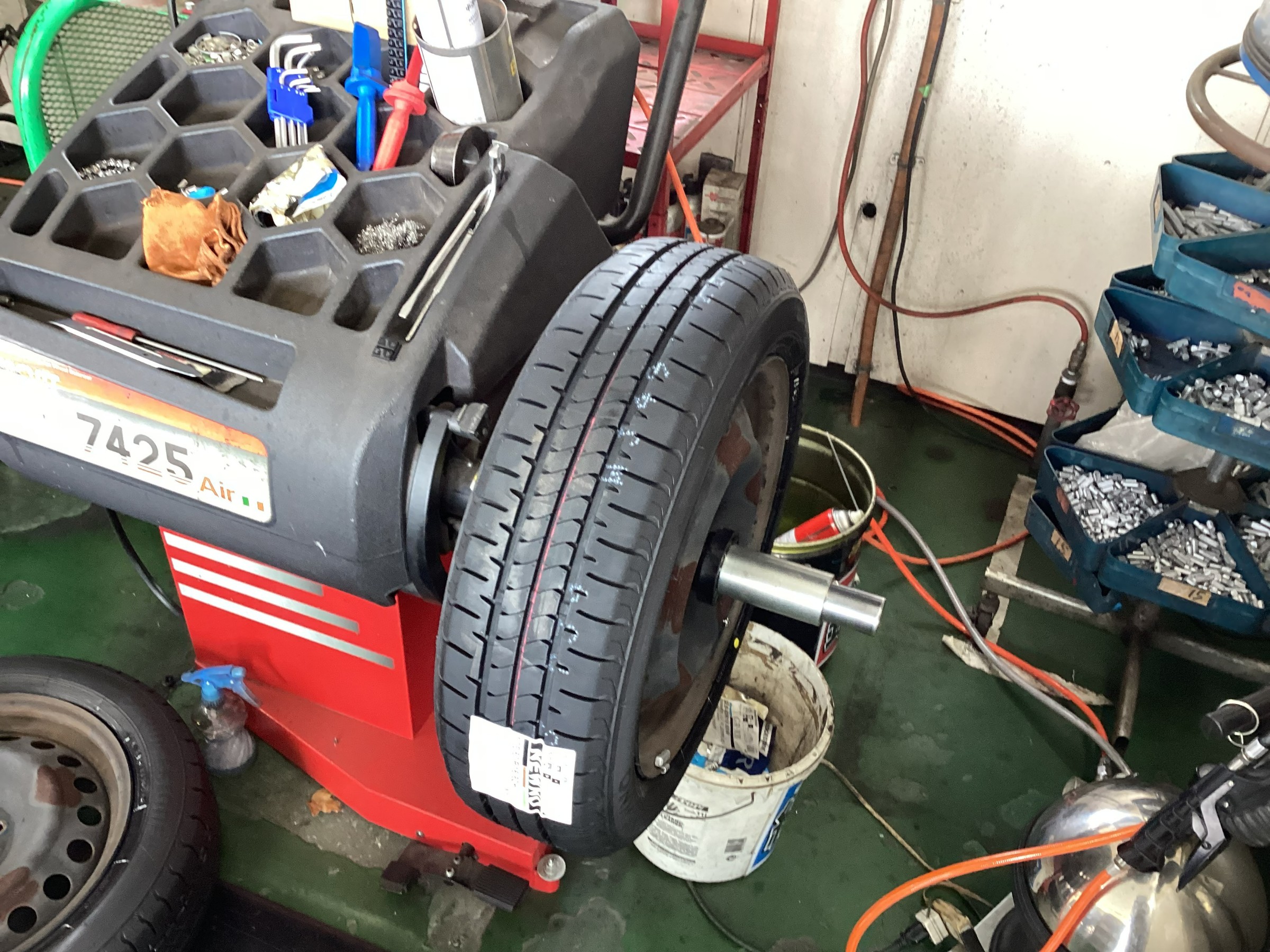 タイヤを組んだ後、メーカー指定の空気圧に調整し、タイヤの回転バランスを調整します。