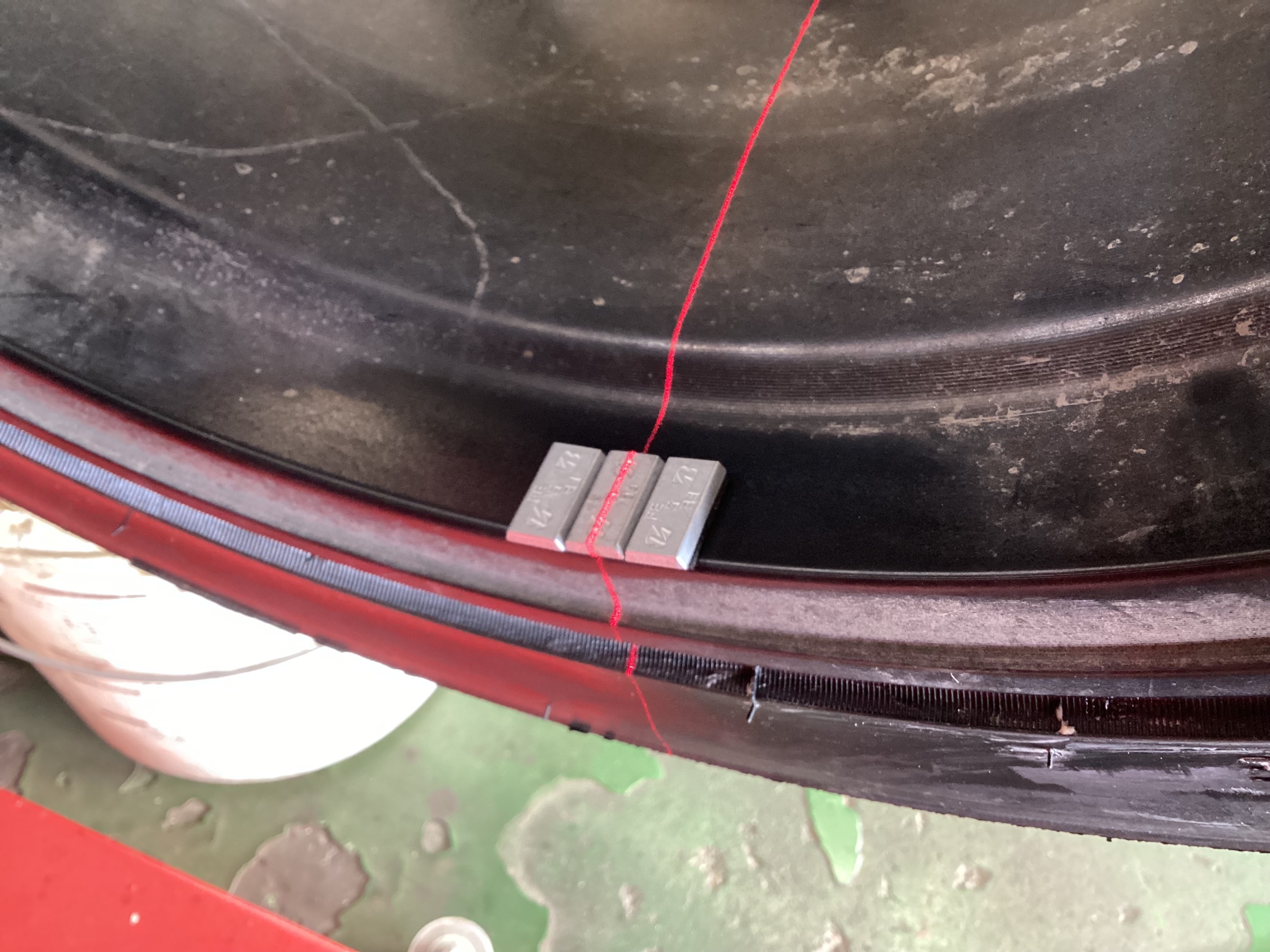 ホイールをバランサーに掛け、回転バランスを調整ます。