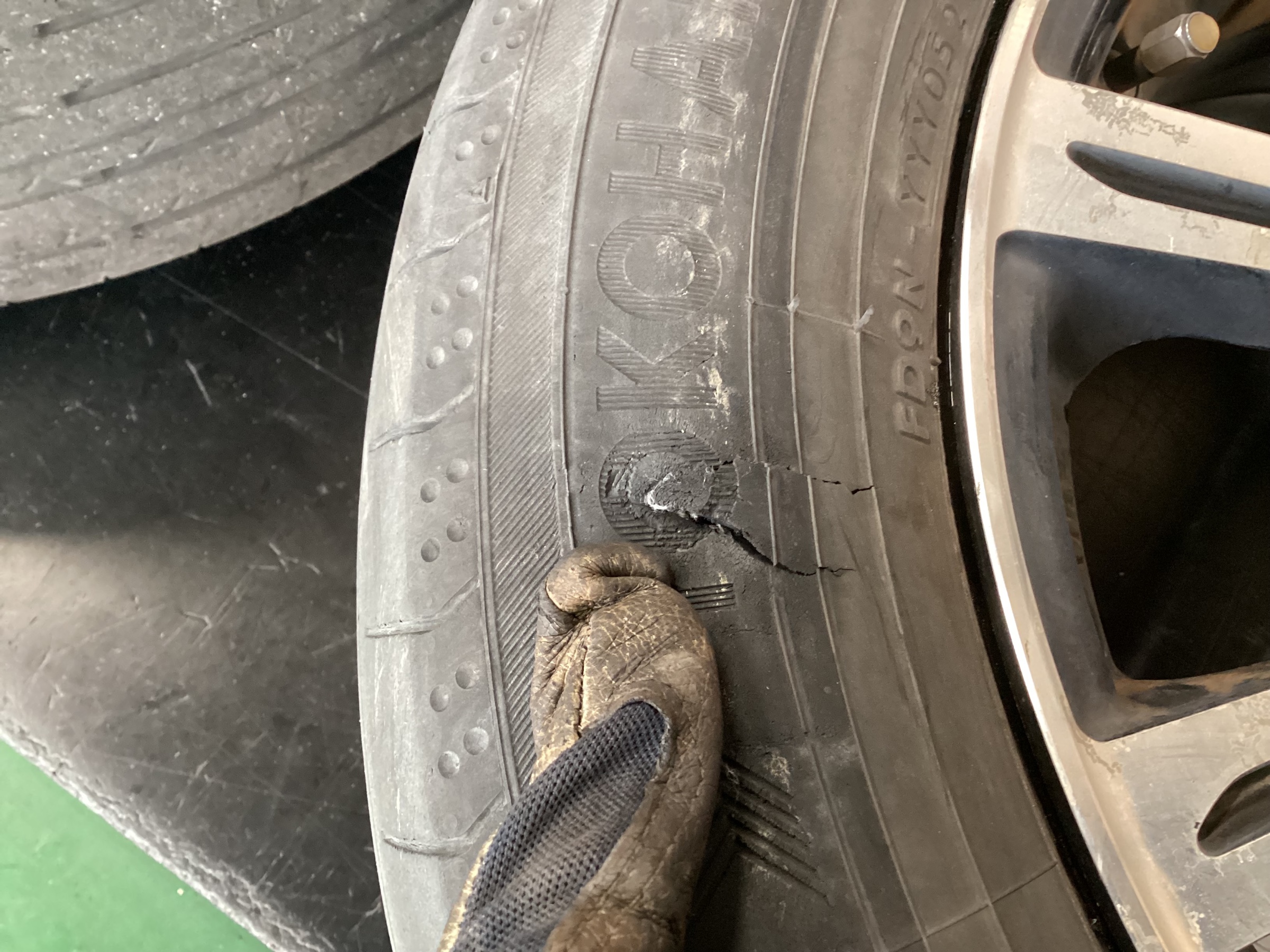 側面を縁石か何かに引っ掛けてパンクした様です。
