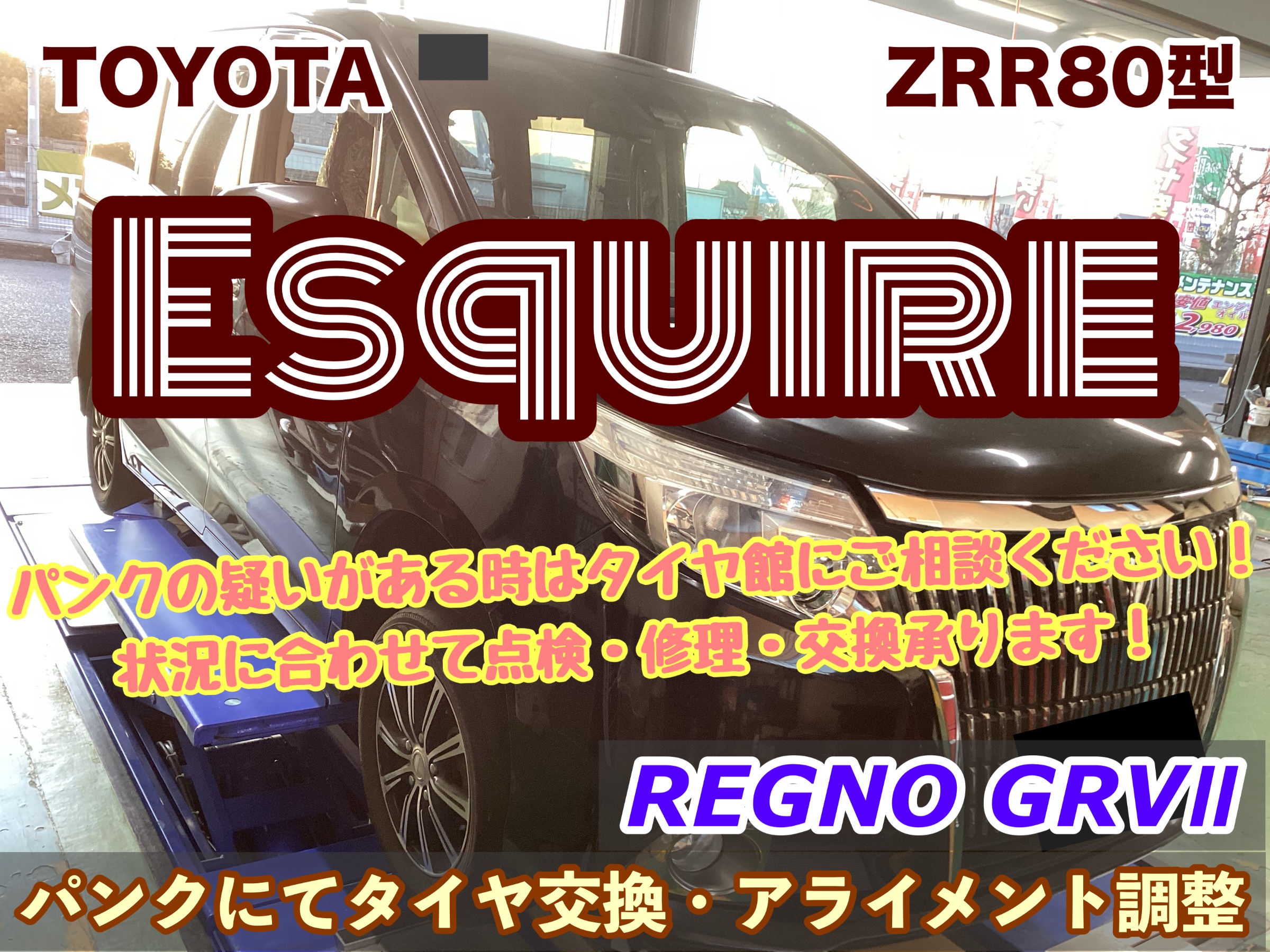【TOYOTA Esquire ZRR80系】パンクの疑いがある時はタイヤ館にご相談ください!状況に合わせて点検・修理・交換承ります!REGNO GRVⅡ【パンクにてタイヤ交換・アライメント調整】★久喜市・白岡市・菖蒲・加須市・鷲宮・幸手・蓮田・予約★