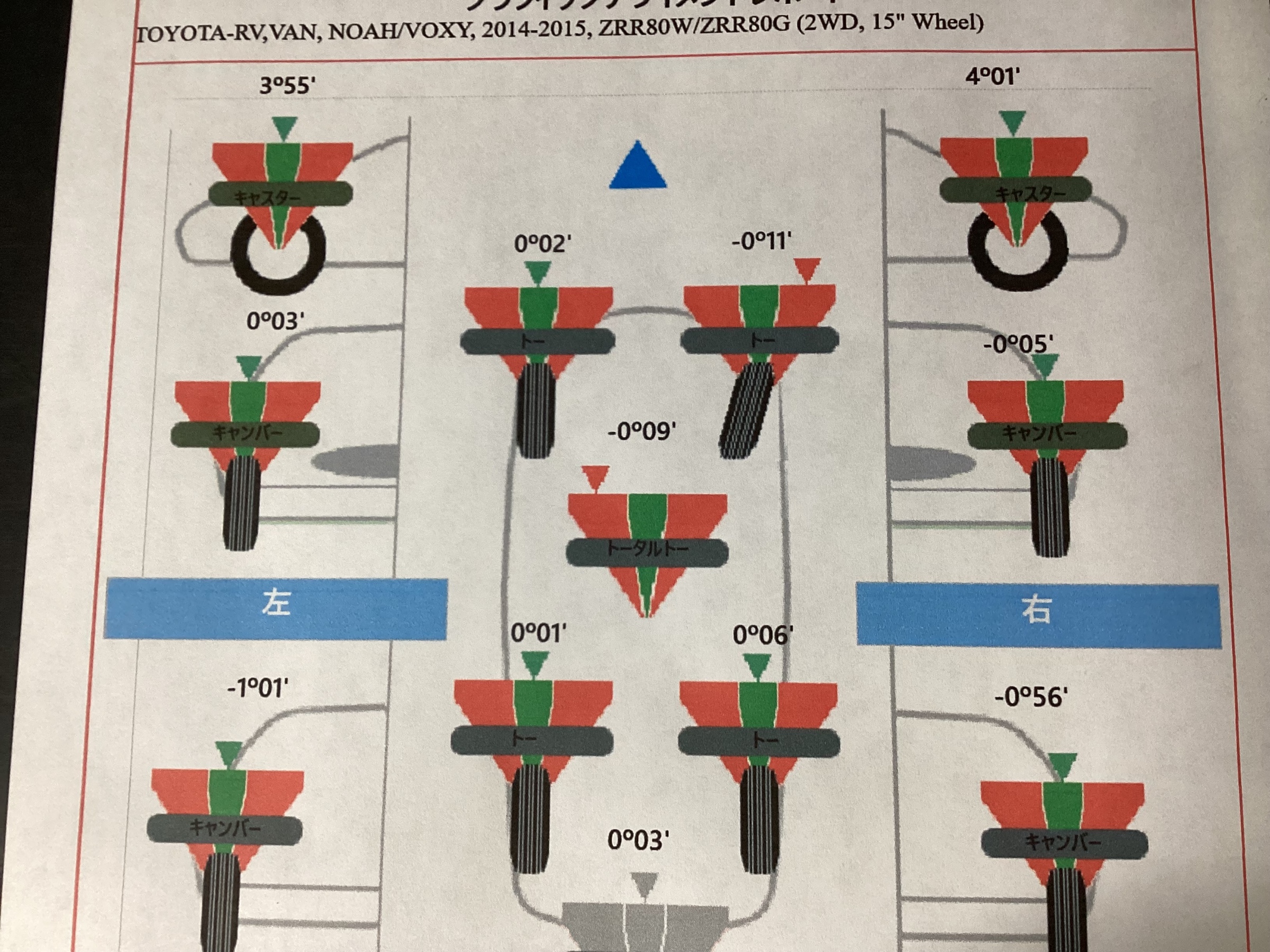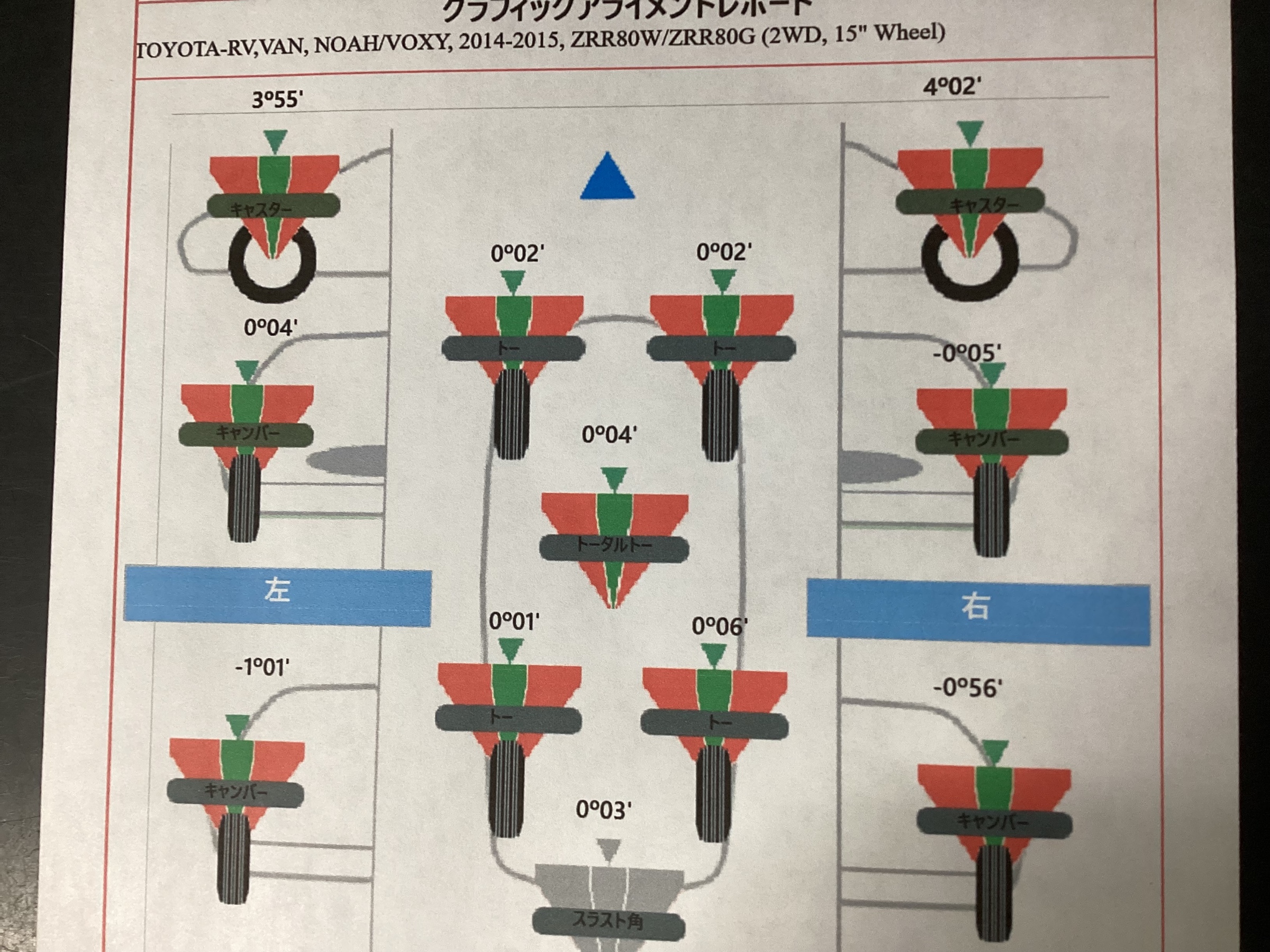 数字を見ると右前輪のトー角度(進行方向への角度)が基準を外れていました。