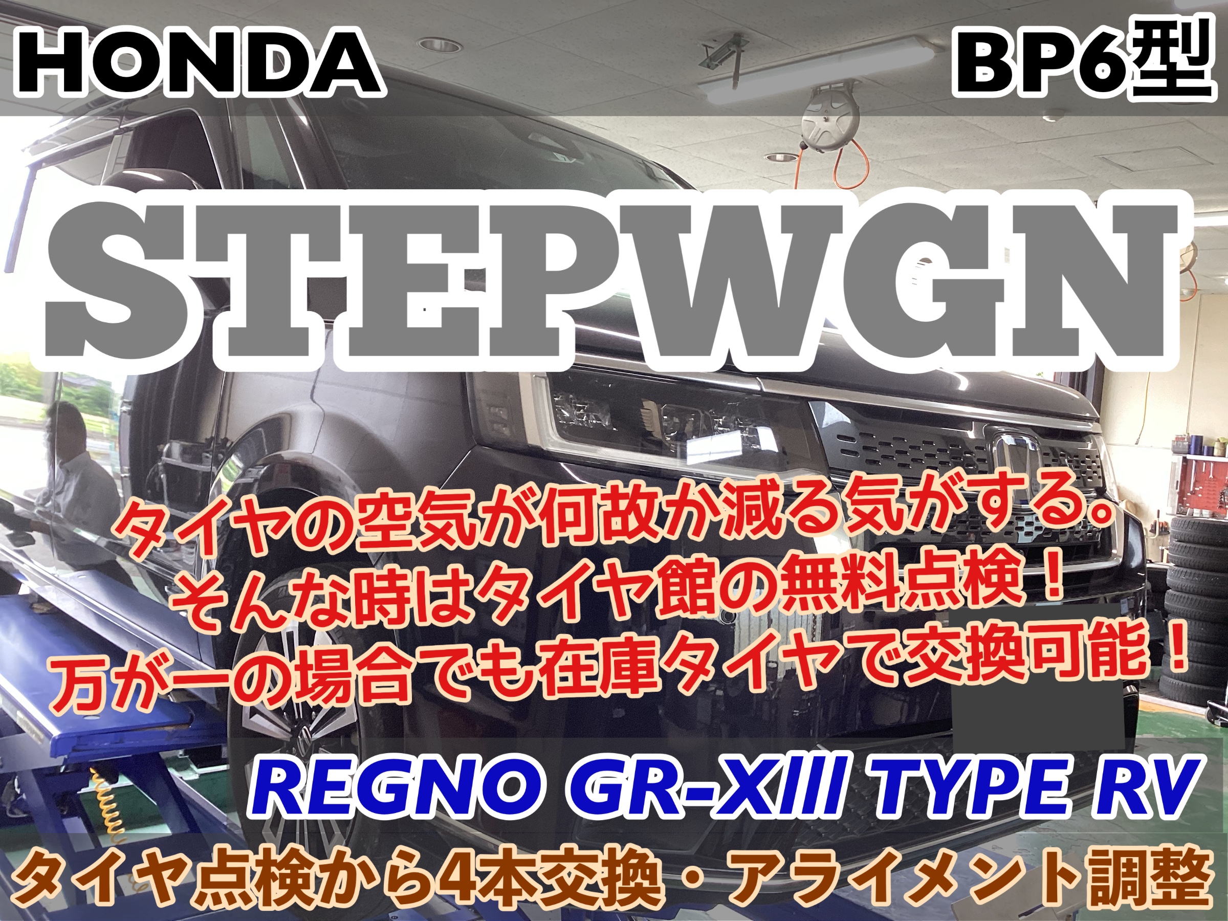 【ホンダ ステップWGN RP6型】タイヤの空気が何故か減る気がする。そんな時はタイヤ館の無料点検!万が一の場合でも在庫タイヤで交換可能!REGNO GR-XⅢ TYPE RV【タイヤ交換・防錆ハブコート・アライメント調整】★久喜市・加須市・白岡市・菖蒲・鷲宮・幸手・蓮田・予約★
