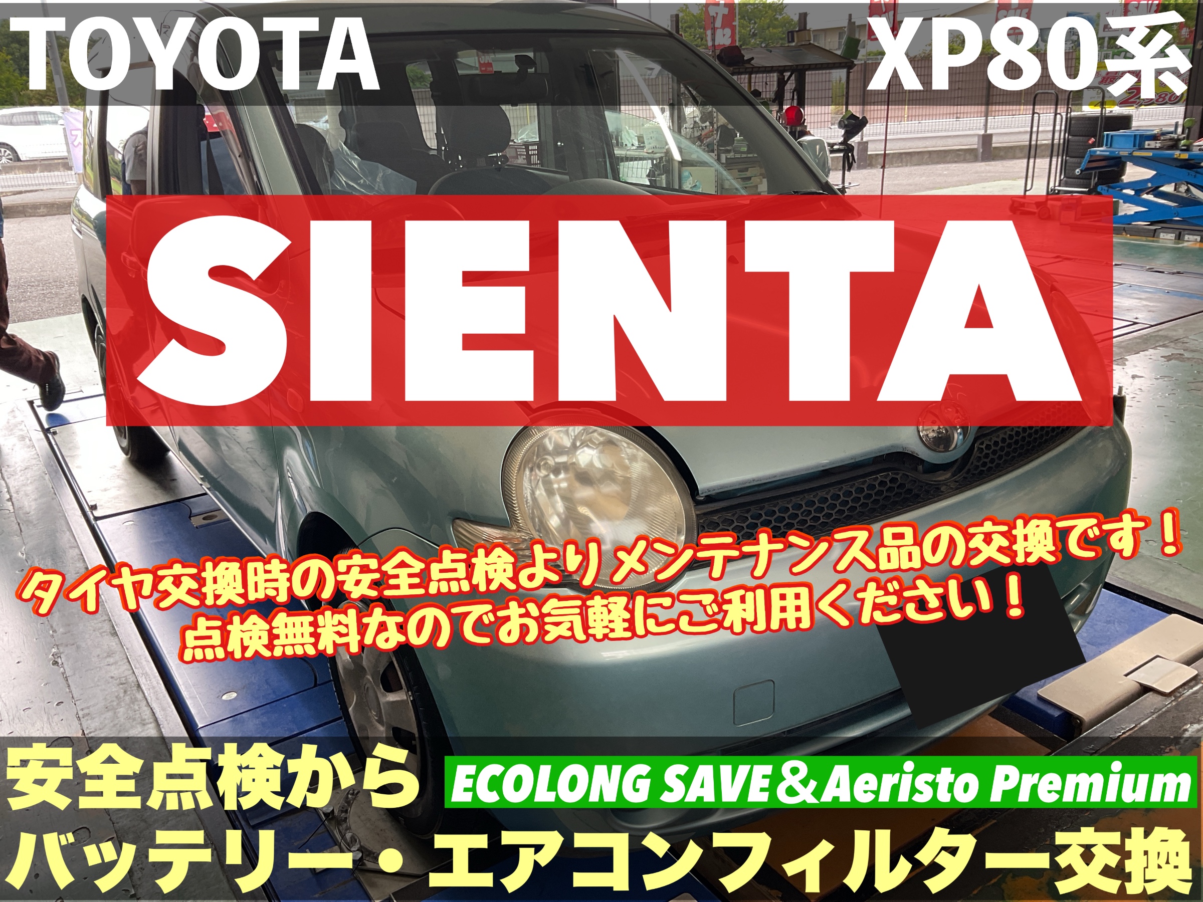 【トヨタ シエンタ XP80系】タイヤ交換時の安全点検よりメンテナンス品の交換です!点検無料なのでお気軽にご利用ください!エコロングセーブ&アエリストプレミアム【安全点検からバッテリー・エアコンフィルター交換】★久喜市・加須市・白岡市・菖蒲・鷲宮・幸手・蓮田・予約★