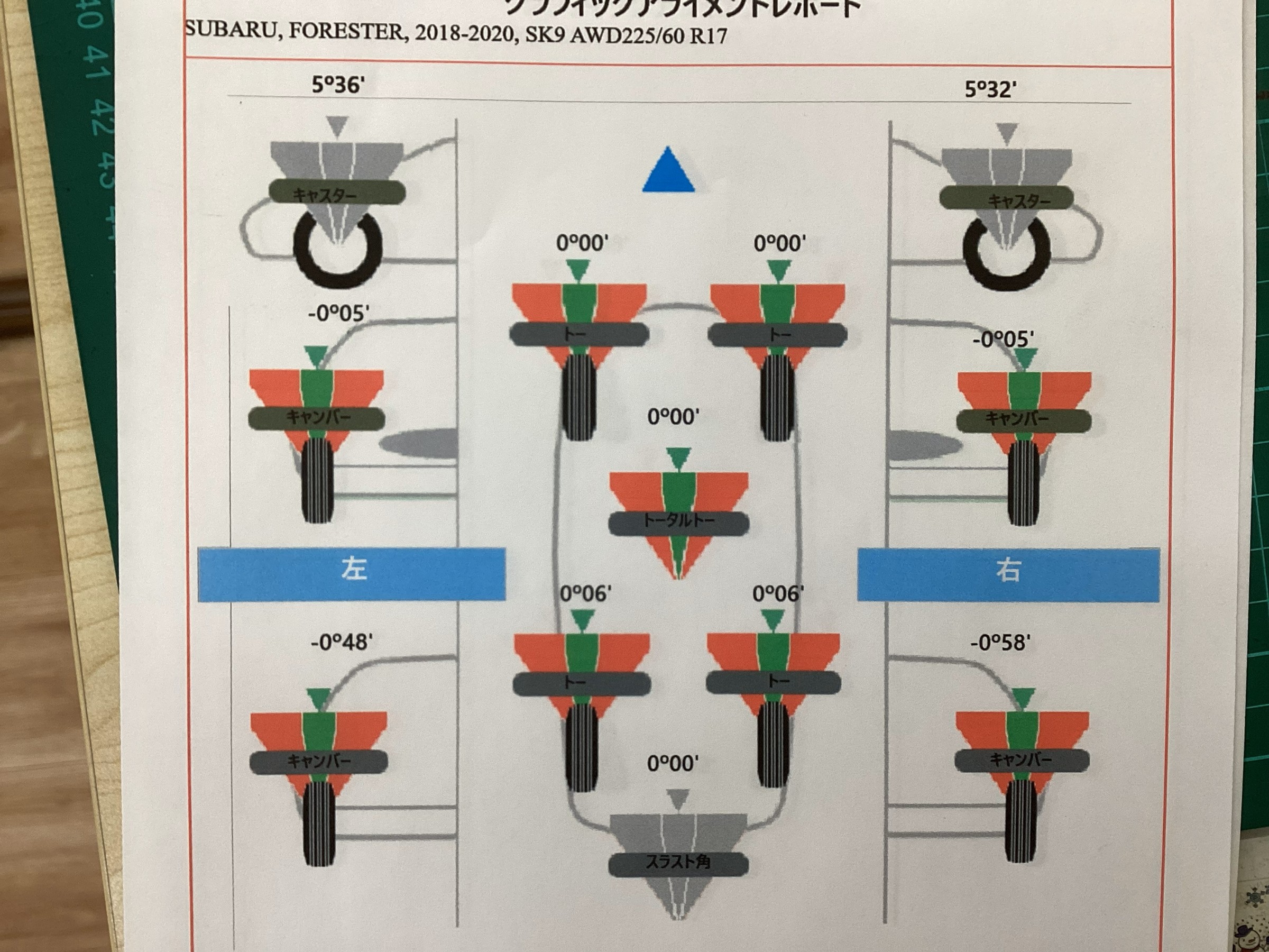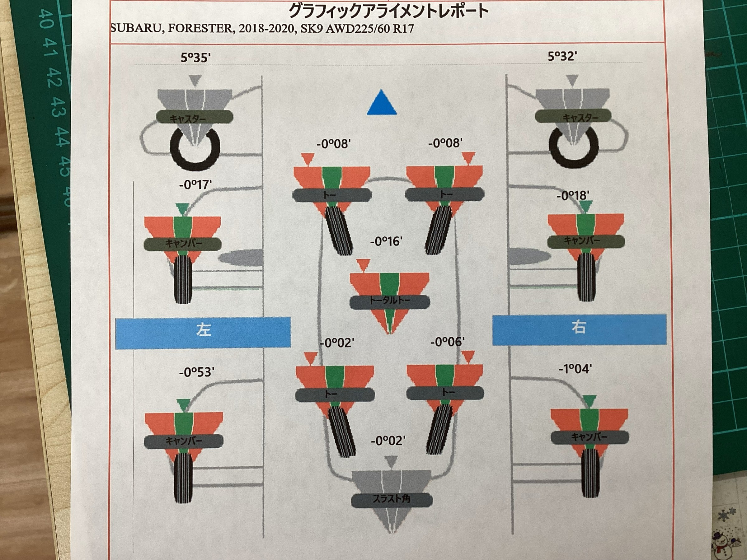 前後共にトー角度が外向きで基準値を外れていました。
