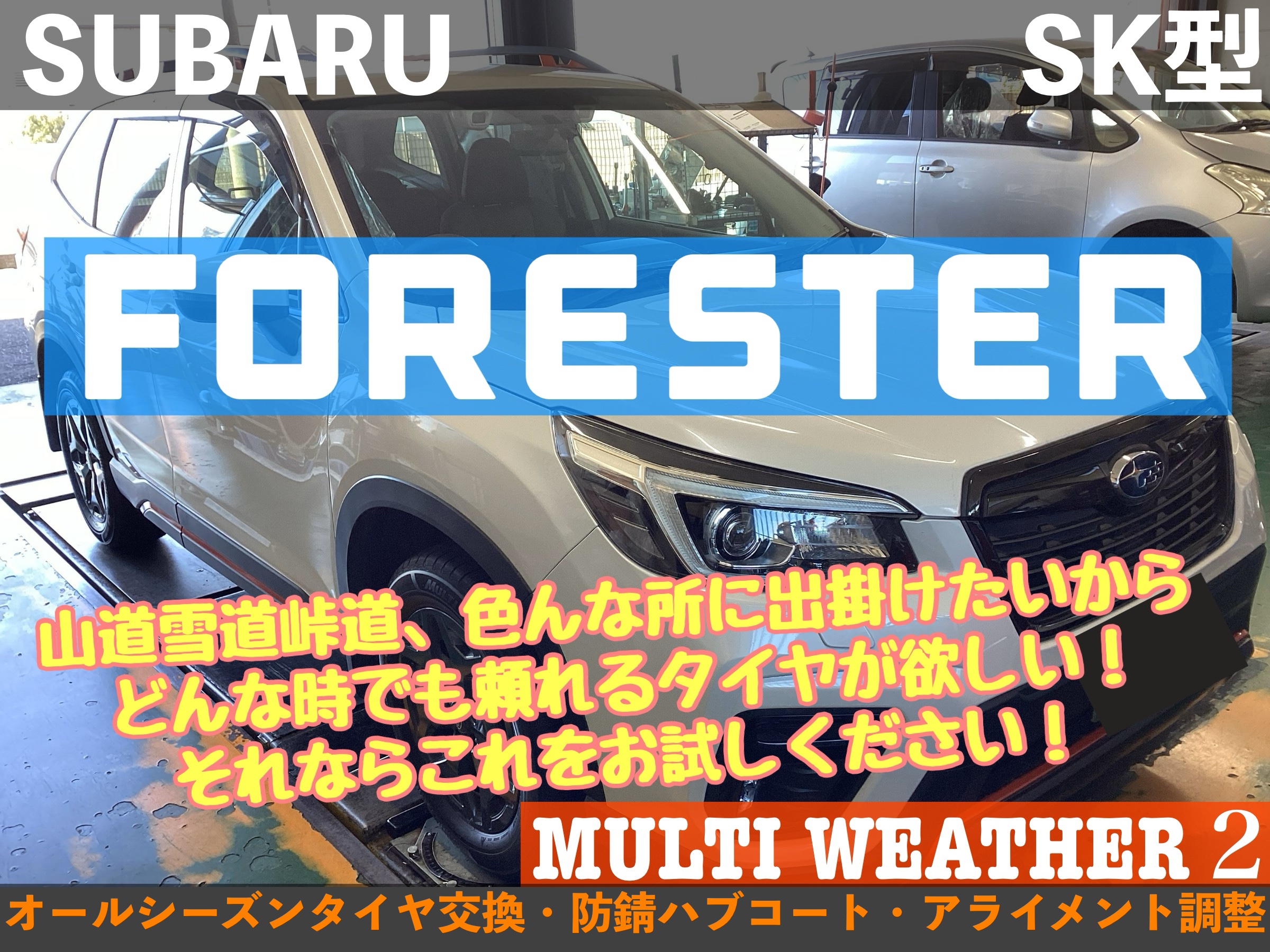 【スバル フォレスター SK後期型】山道雪道峠道、色んな所に出掛けたいからどんな時でも頼れるタイヤが欲しい!それならこれをお試しください!MULTI WEATHER2【オールシーズンタイヤ交換・防錆ハブコート・アライメント調整】★久喜市・加須市・白岡市・菖蒲・鷲宮・幸手・蓮田・予約★
