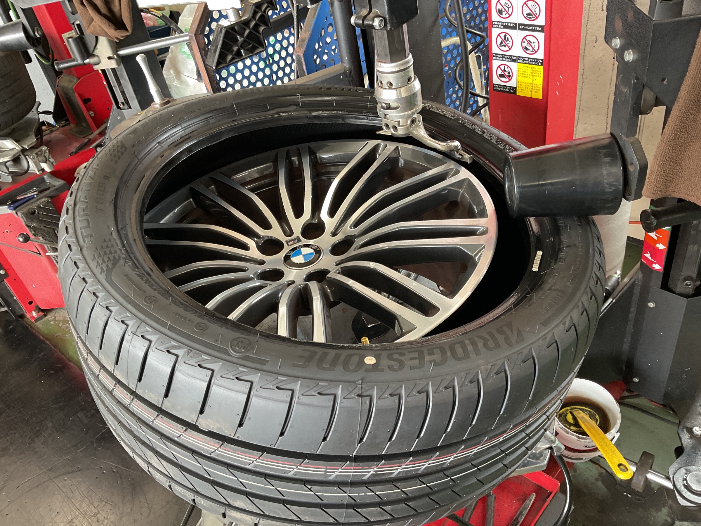 作業はタイヤ交換、窒素ガス充填、ホイールバランス調整の順に行います。