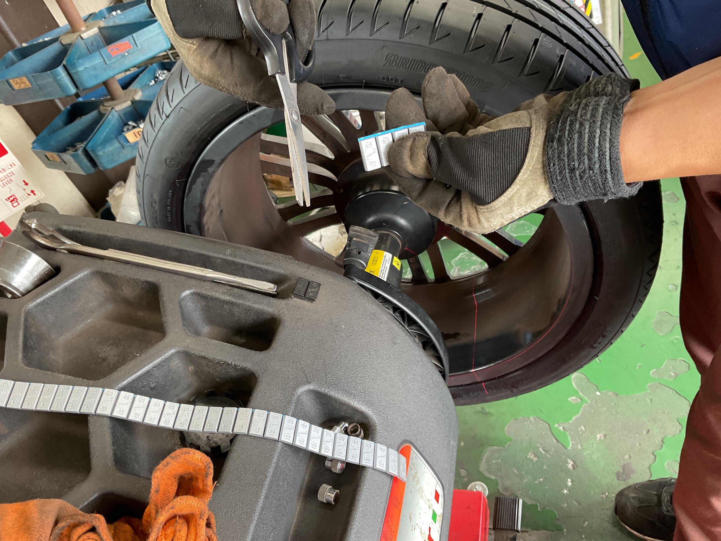 まずは車両からタイヤ・ホイールを外し、空気を抜き、バランスウエイトを外します。