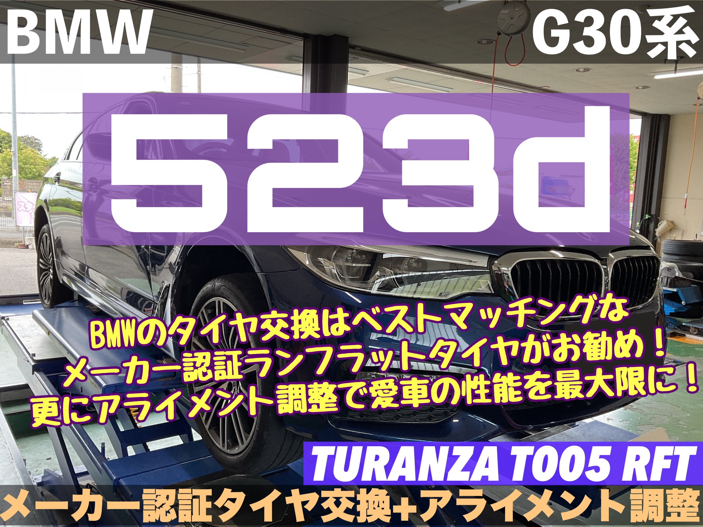 【BMW 523d G30系】BMWのタイヤ交換はベストマッチングなメーカー認証ランフラットタイヤがお勧め!更にアライメント調整で愛車の性能を最大限に!TURANZA T005 RFT【メーカー認証タイヤ交換+アライメント調整】★久喜市・加須市・白岡市・菖蒲・鷲宮・幸手・蓮田・予約★