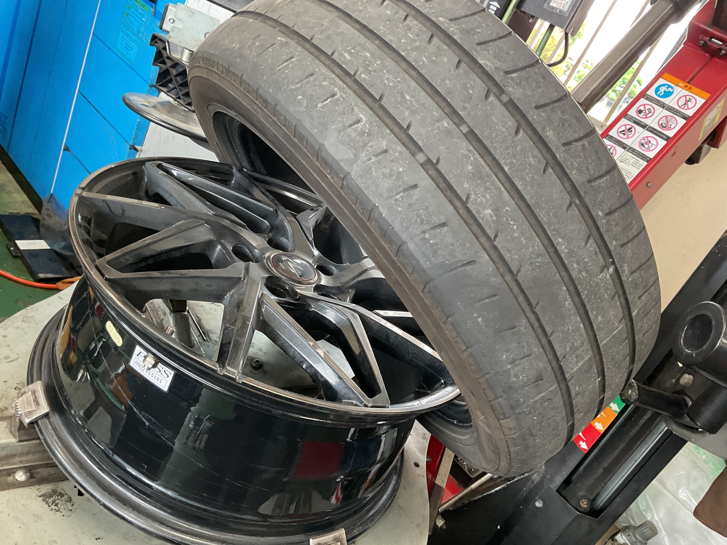 バランス調整とは、空気を充填したタイヤ・ホイールを専用の機械に取り付けて回転させ計測し、