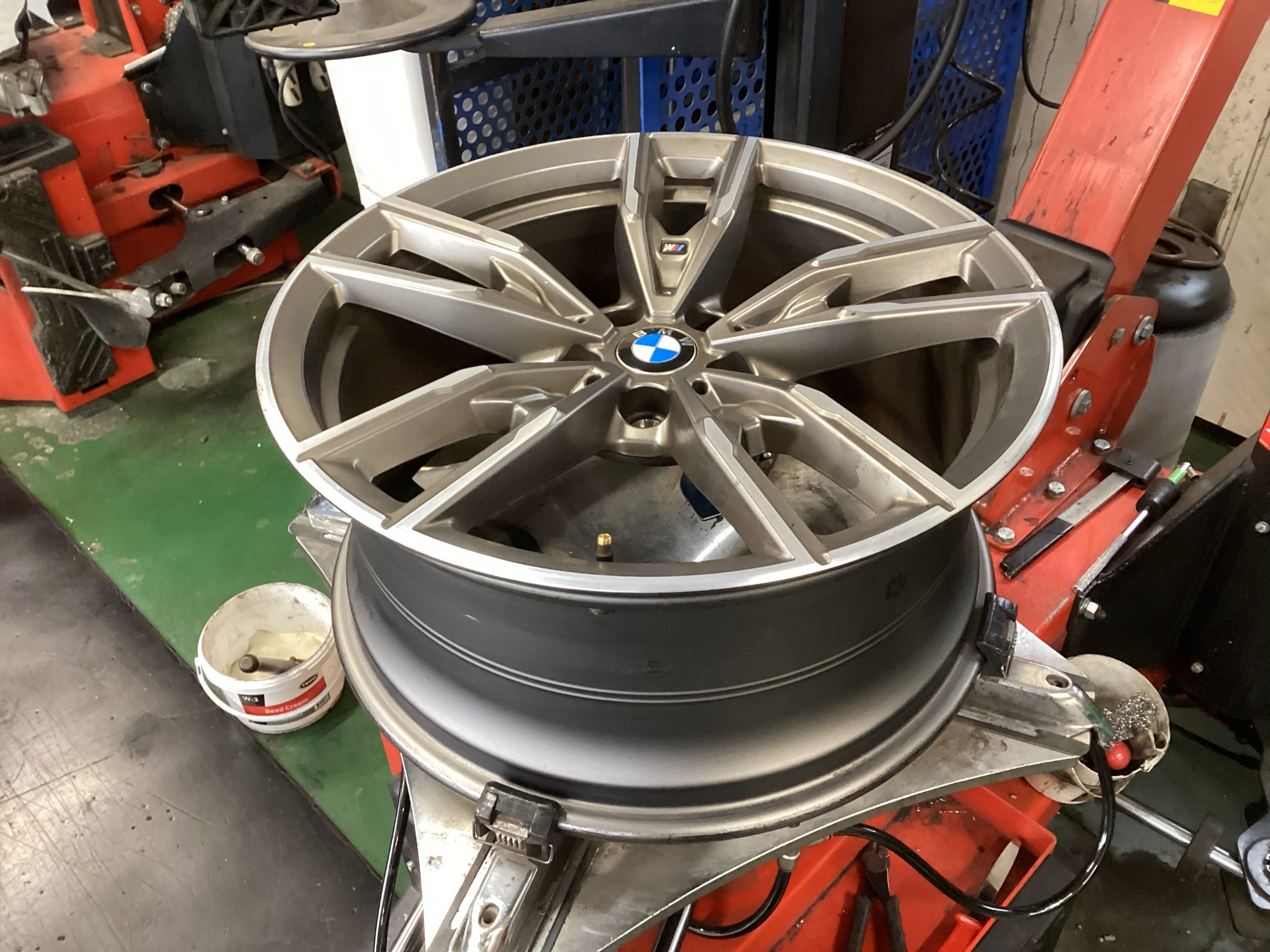 タイヤチェンジャーで古いタイヤとホイールを分解します。