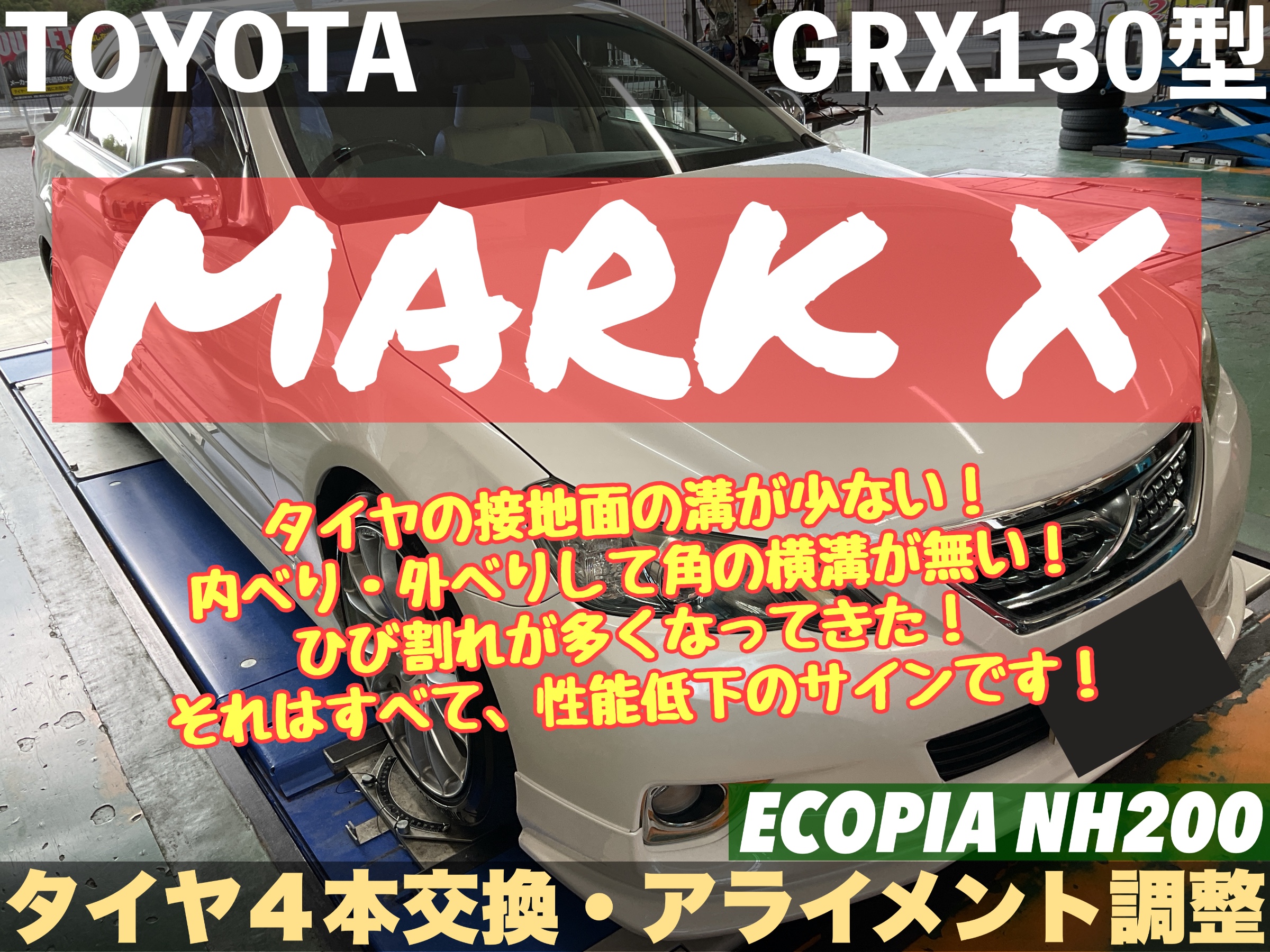 【トヨタ マークX GRX130型】タイヤの接地面の溝が少ない!内べり・外べりして角の横溝が無い!ひび割れが多くなってきた!それはすべて、性能低下のサインです!ECOPIA NH200【タイヤ4本交換・アライメント調整】★久喜市・加須市・白岡市・菖蒲・鷲宮・幸手・蓮田・予約★