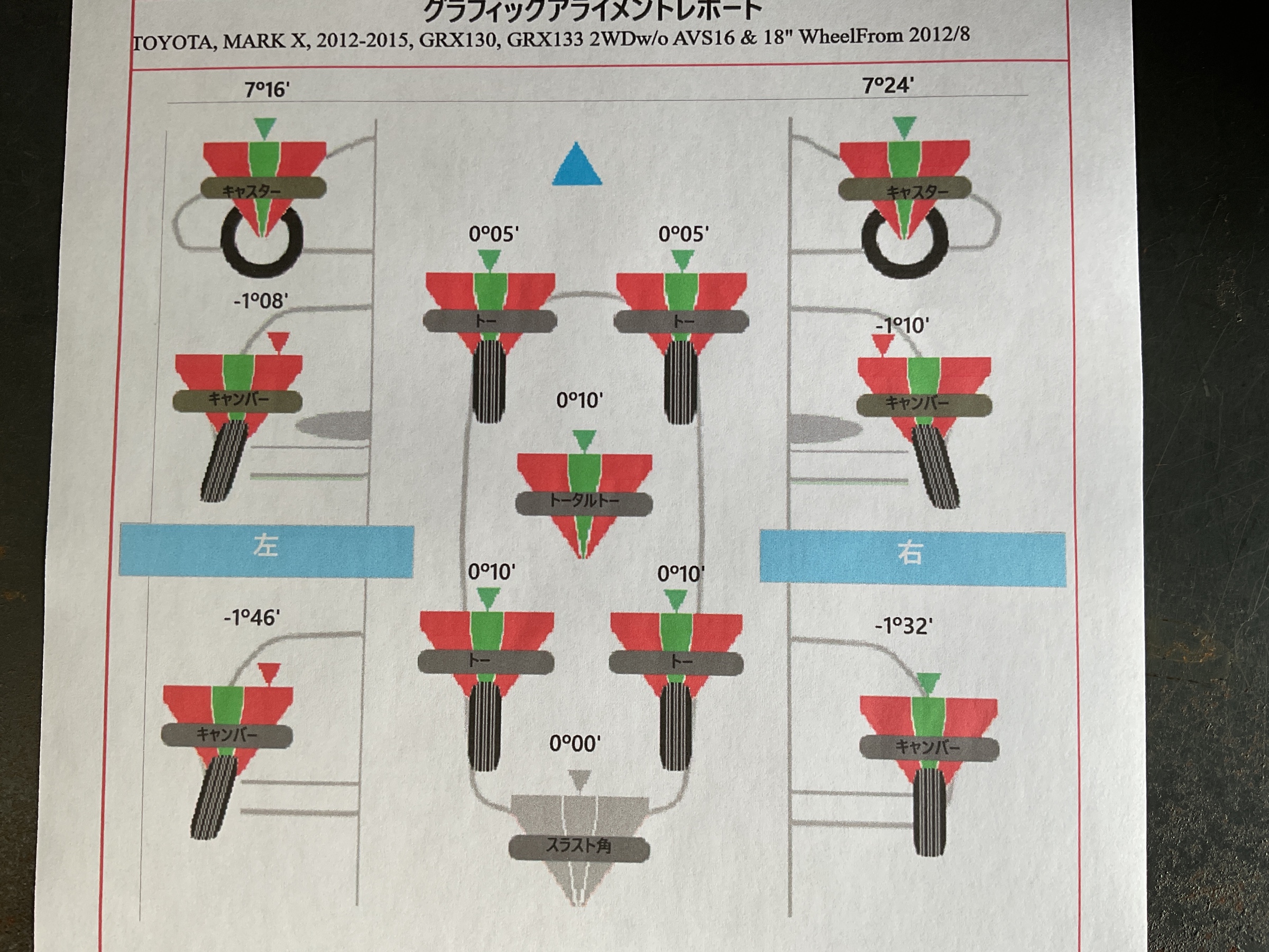 測定結果を見ると前後のトー角度(進行方向への角度)は