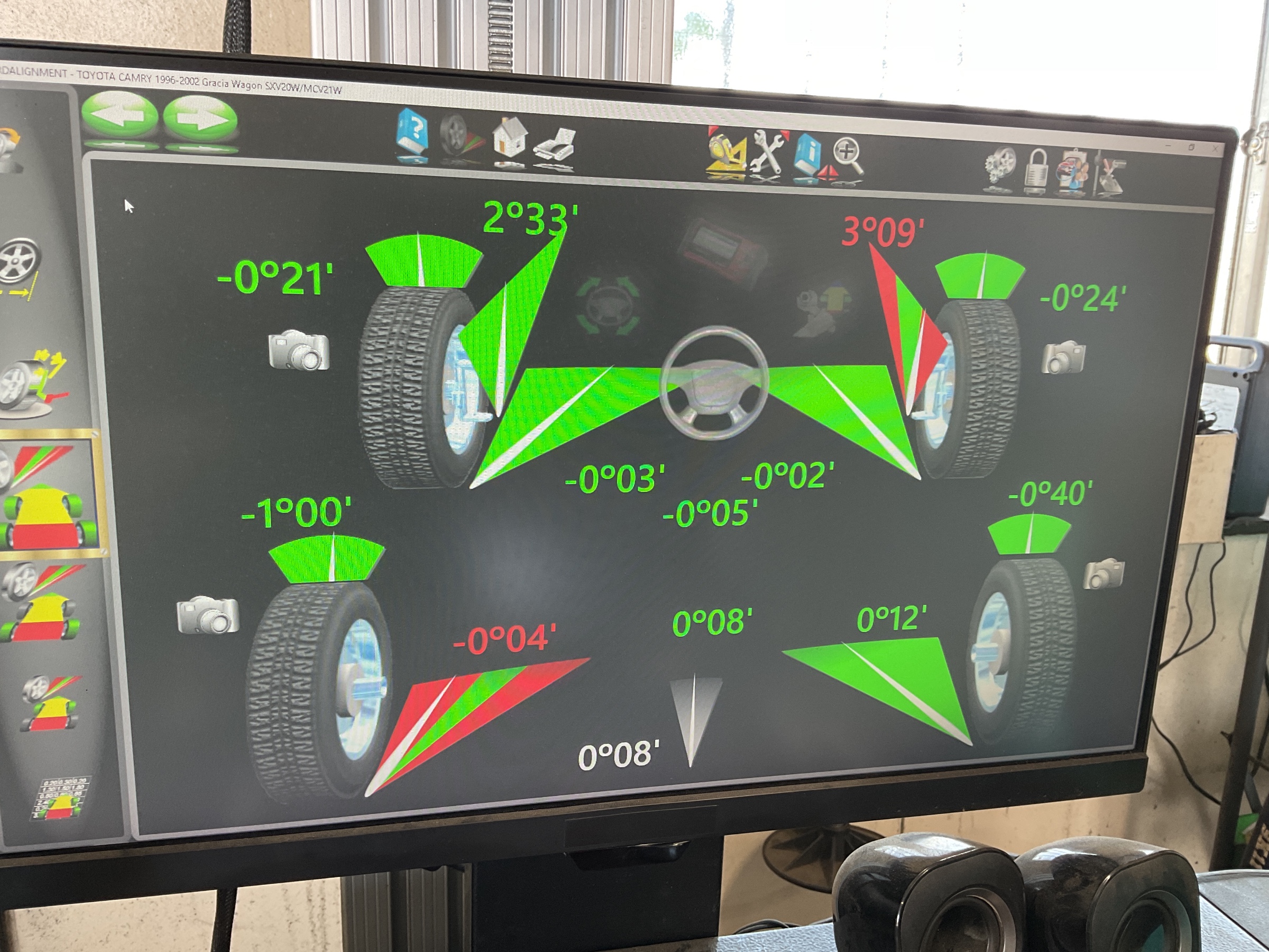 アライメント調整では、お客様のお車に合わせその足廻りの微妙な角度の歪みを調整します。