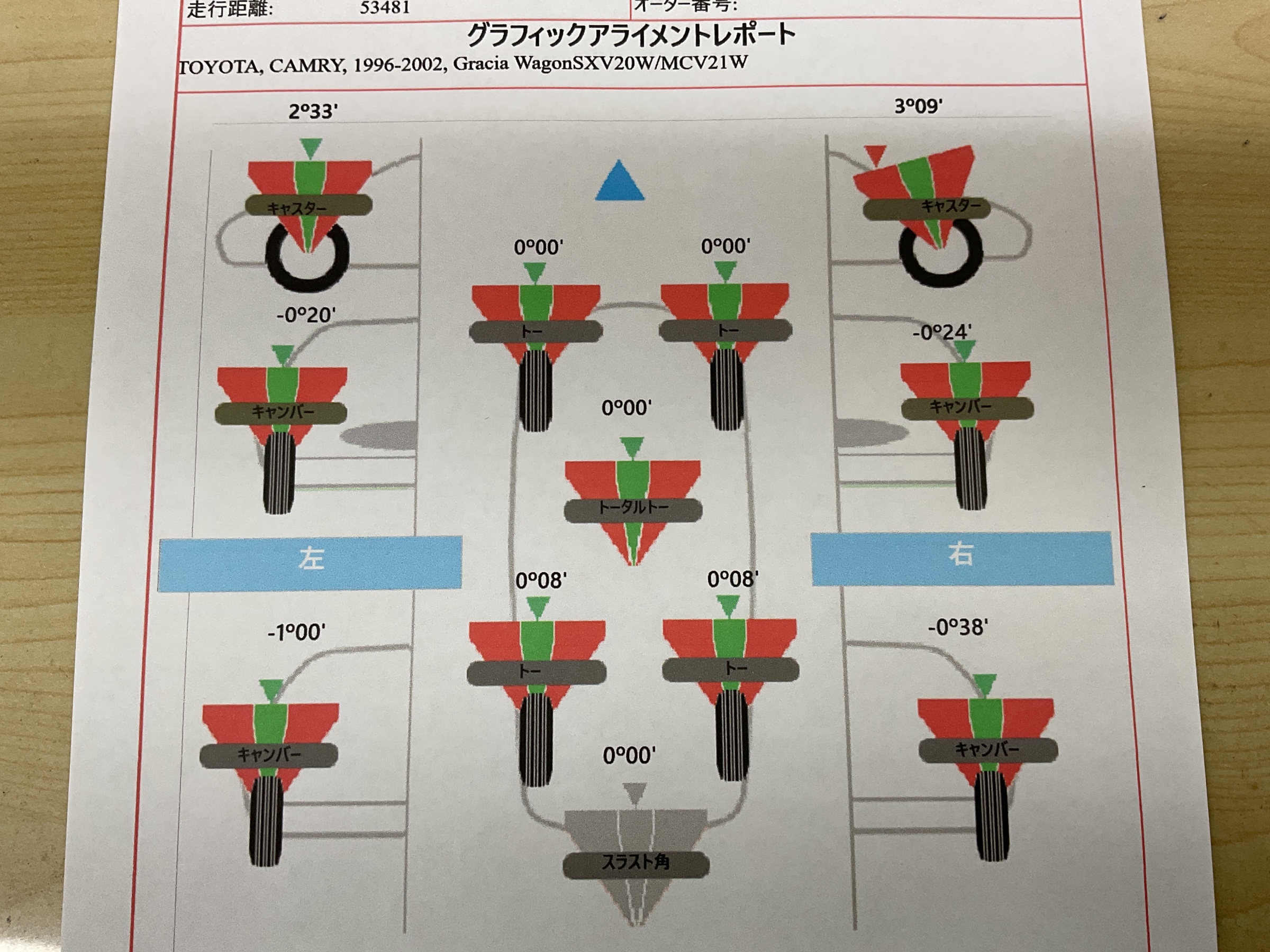 前輪のトー角度はマイナスとはいえ左右ほぼ均等でした。