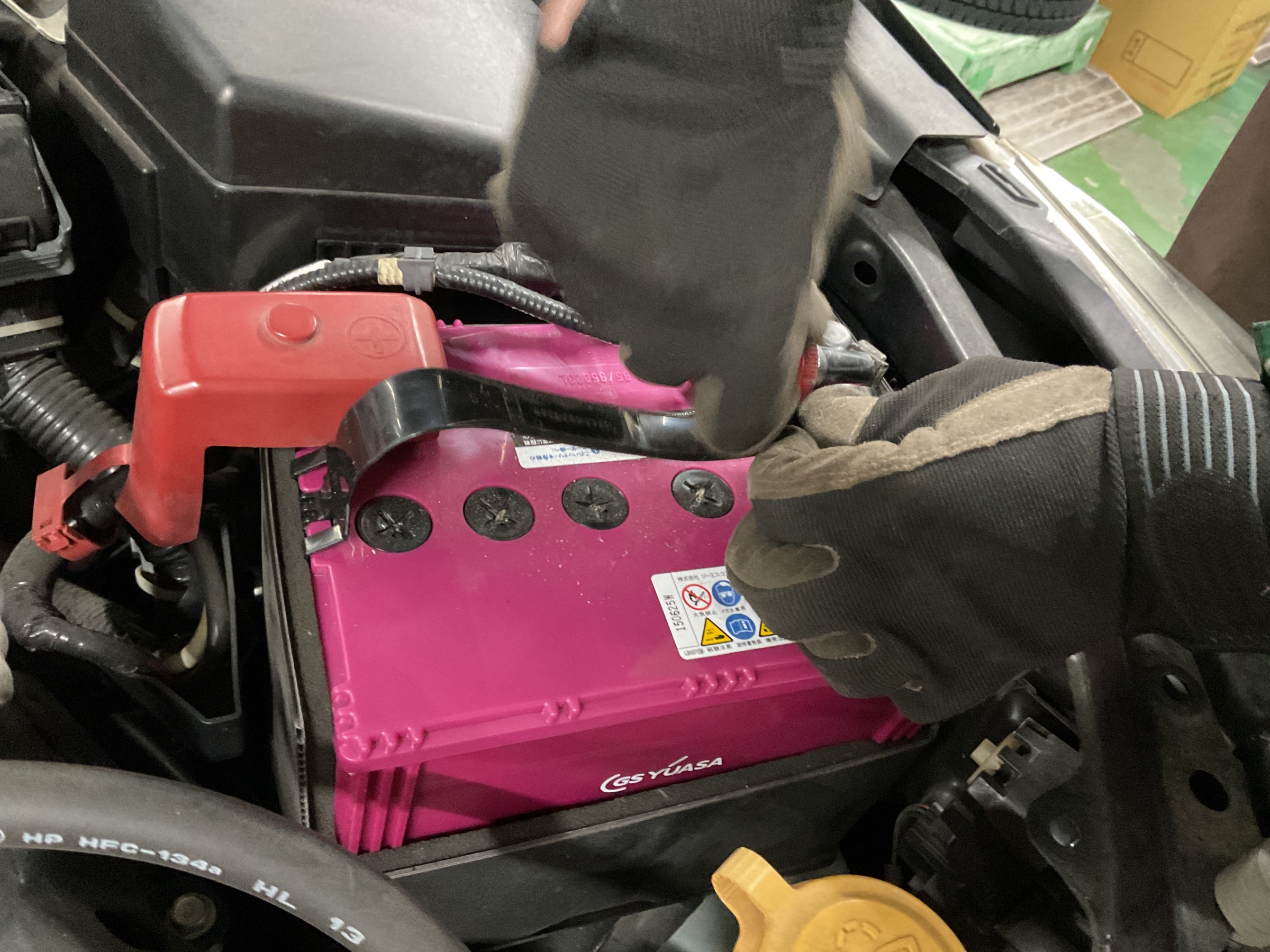 交換手順は①ステーの取り外し ②マイナス端子の取り外し ③プラス端子の取り外しです。