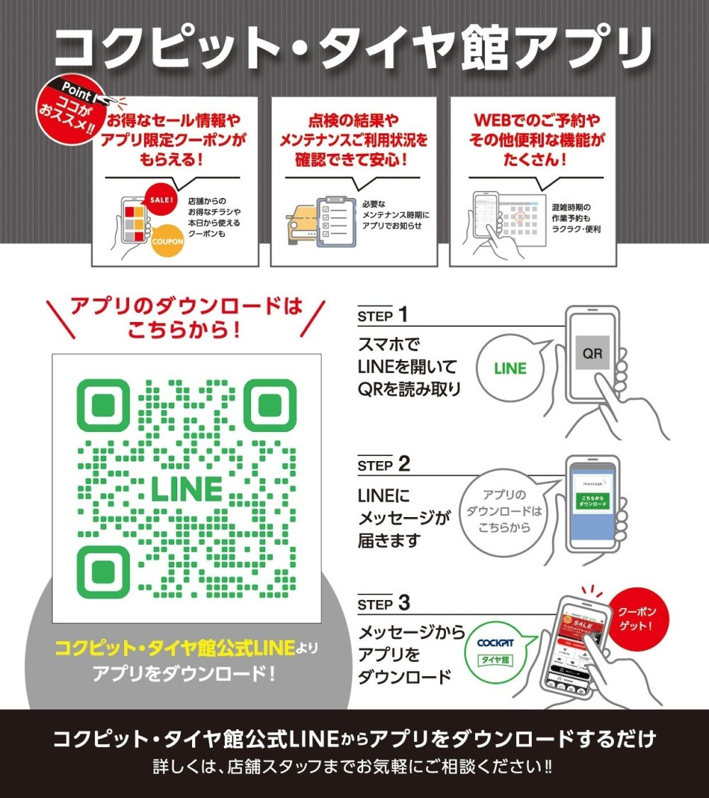 ◇タイヤ館久喜の公式LINEを友だち登録頂くと、各種作業・ご相談の予約が簡単にできます。