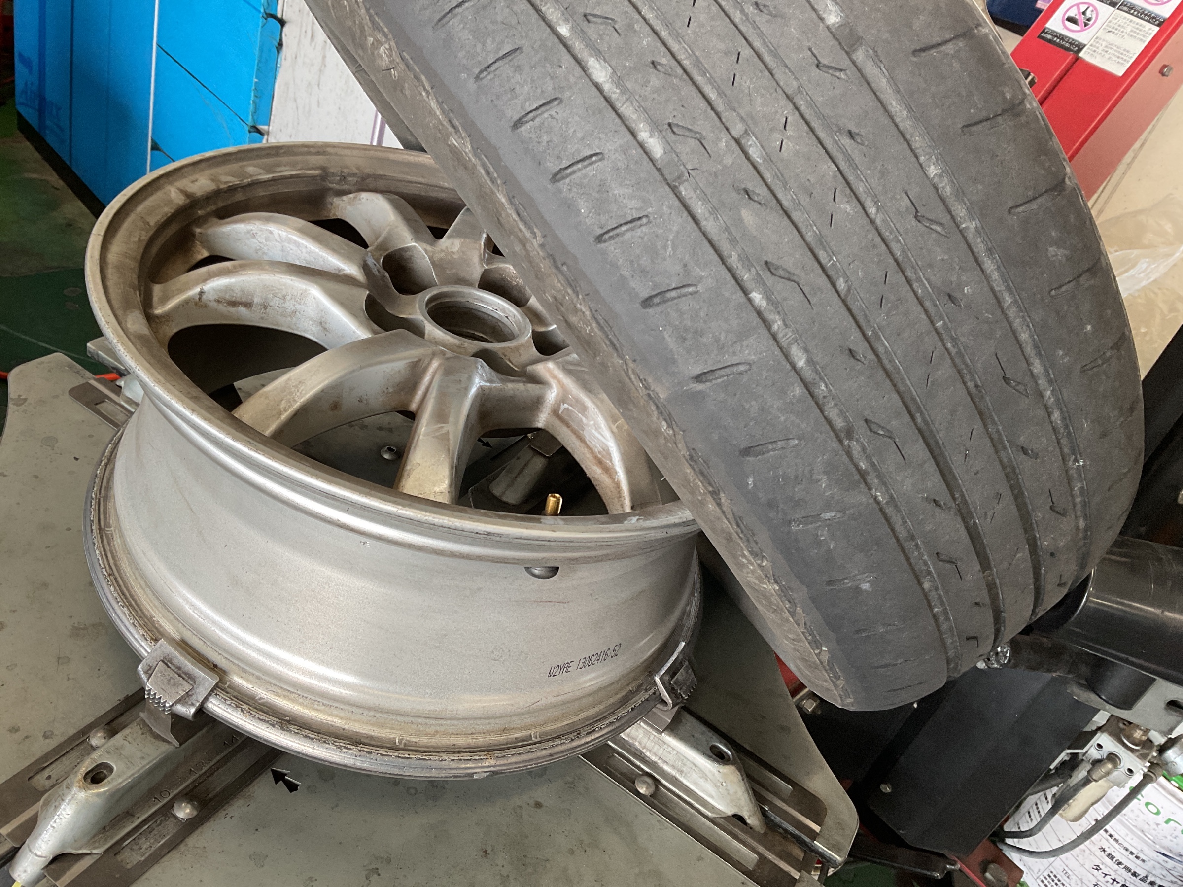 作業はまずは車両からタイヤ・ホイールを外し、空気を抜き、バランスウエイトを外します。