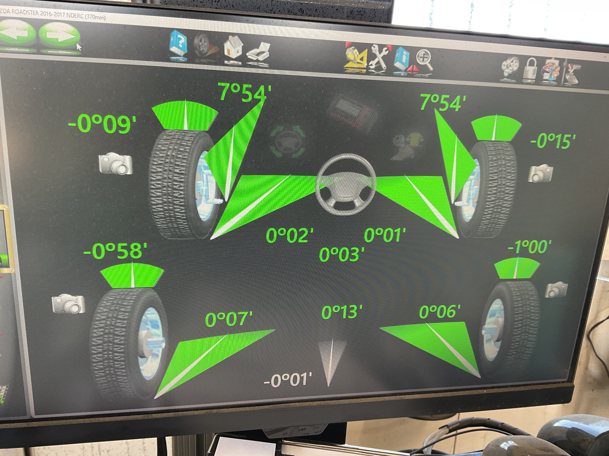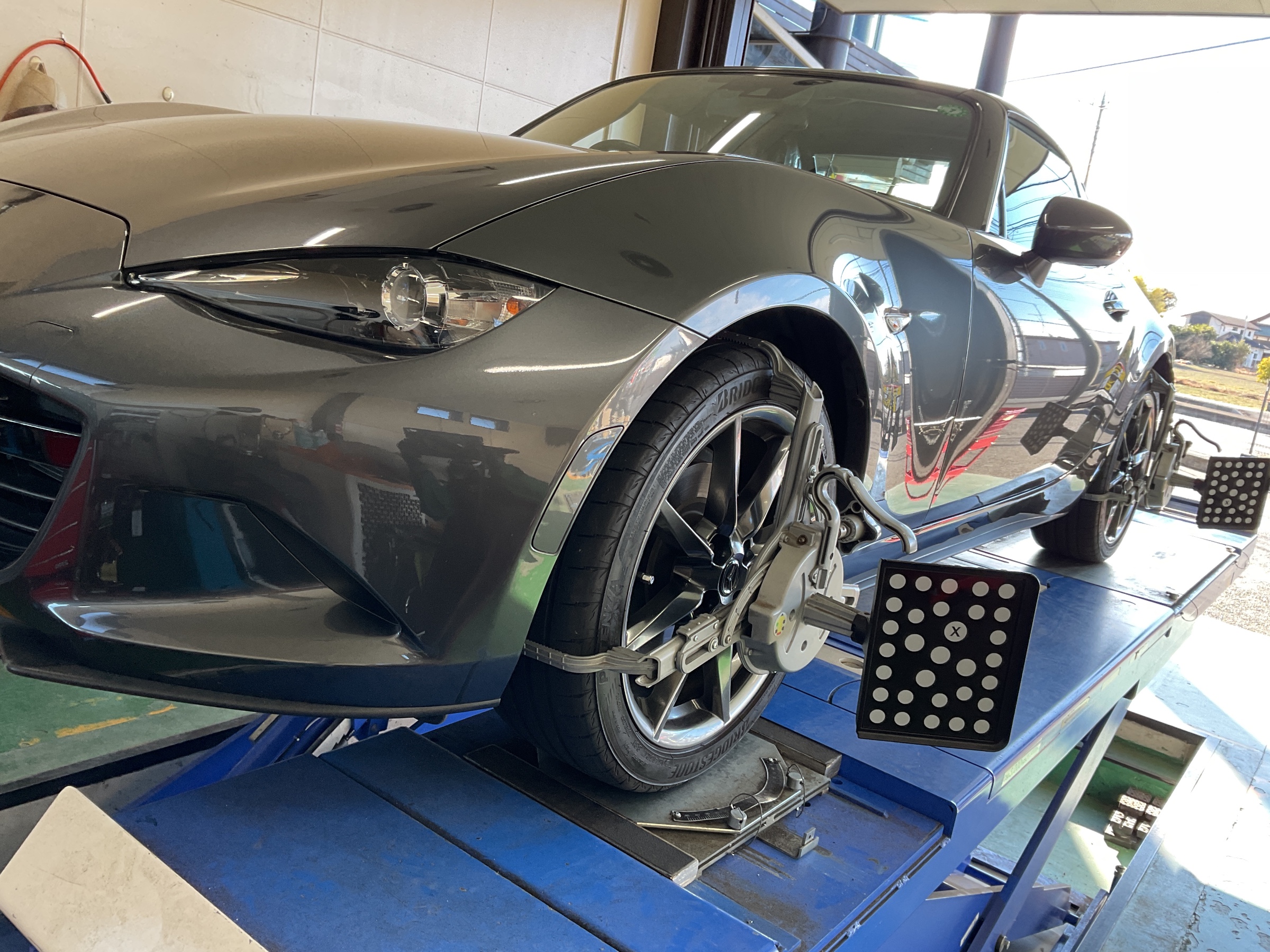 【マツダ ロードスター ND型】タイヤを上手に使うためには前後のローテーションは必須です!一緒にホイールバランスを再調整してタイヤの状態を改善!更にアライメントの定期測定で車両の状態を確認!これで完璧!【タイヤローテーション・ホイールバランス・アライメント測定】★久喜市・加須市・白岡市・菖蒲・鷲宮・幸手・蓮田・予約★