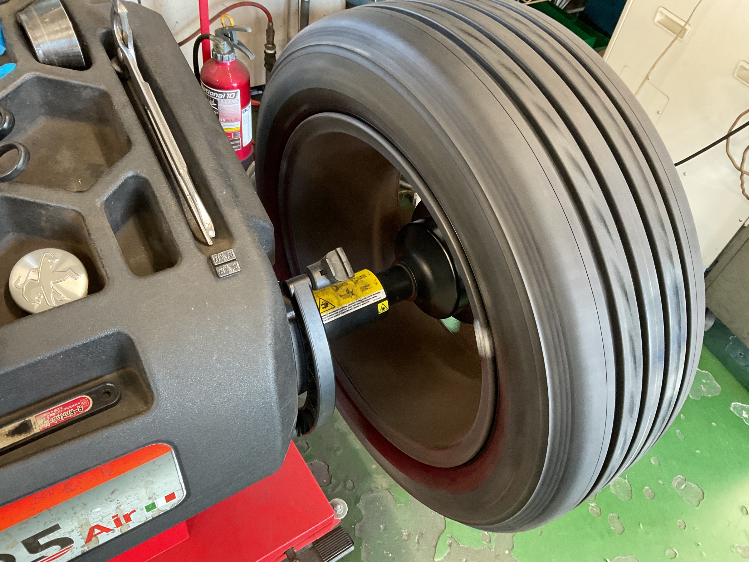 バランス調整とは、空気を充填したタイヤ・ホイールを専用の機械に取り付けて回転させ計測し、