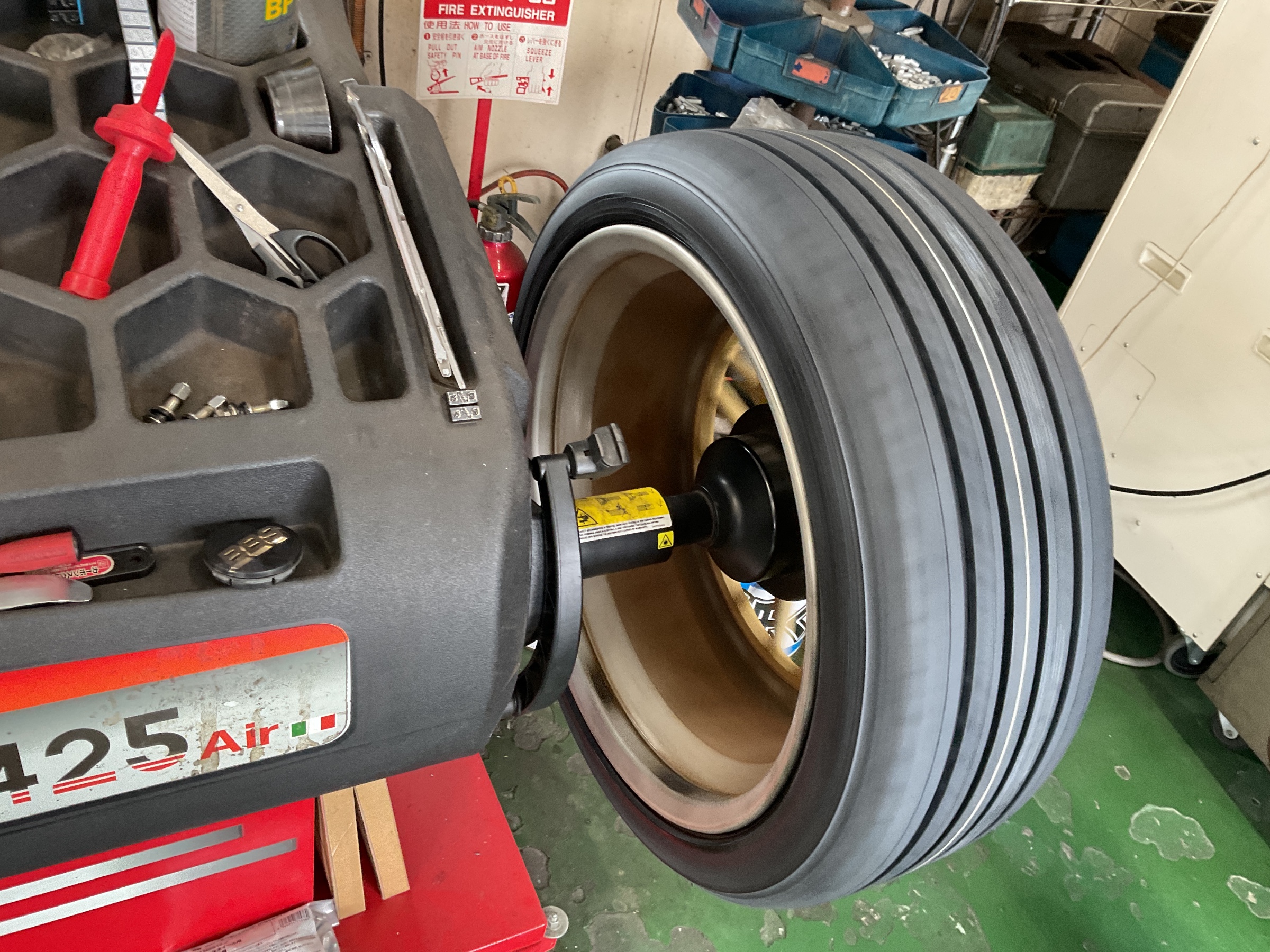 新しいタイヤを組み込んだら空気を充填してホイールバランスを調整します。
