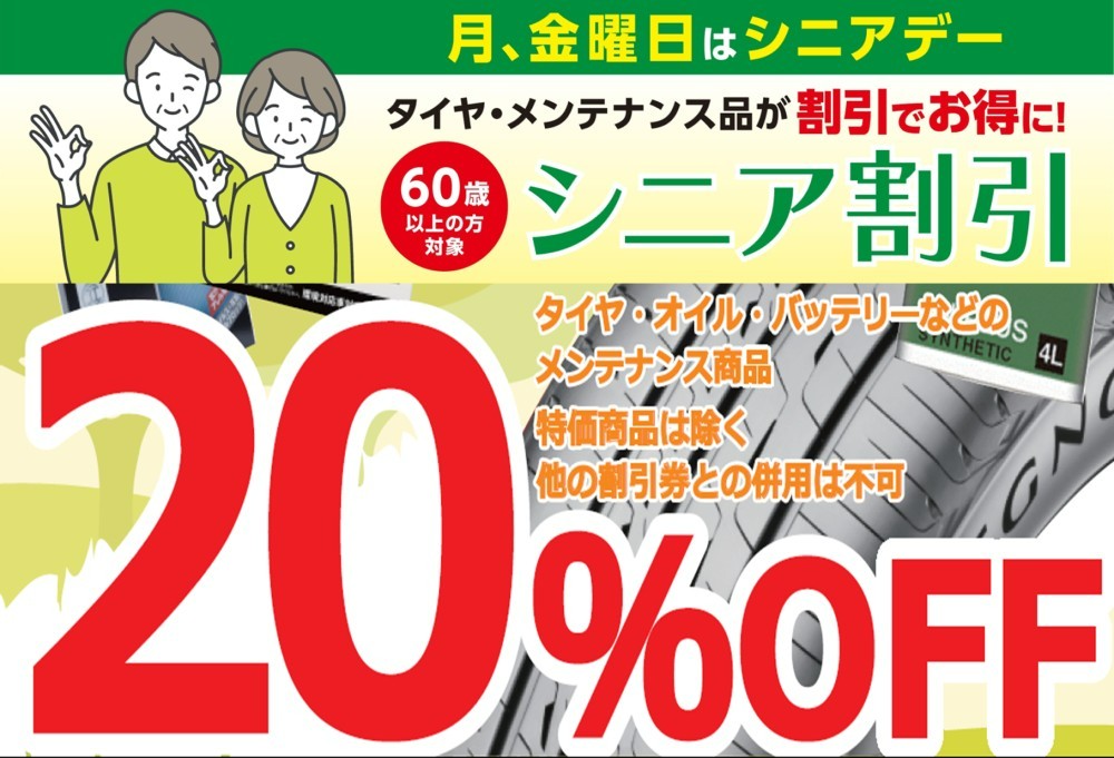 【毎週月曜・金曜の営業日に開催中!】 ★シニアデー でタイヤ・エンジンオイル・メンテナンス品をお得に交換!【元気なシニアドライバーをサポートします!】★久喜市・白岡市・菖蒲・加須市・鷲宮・幸手・蓮田・予約★