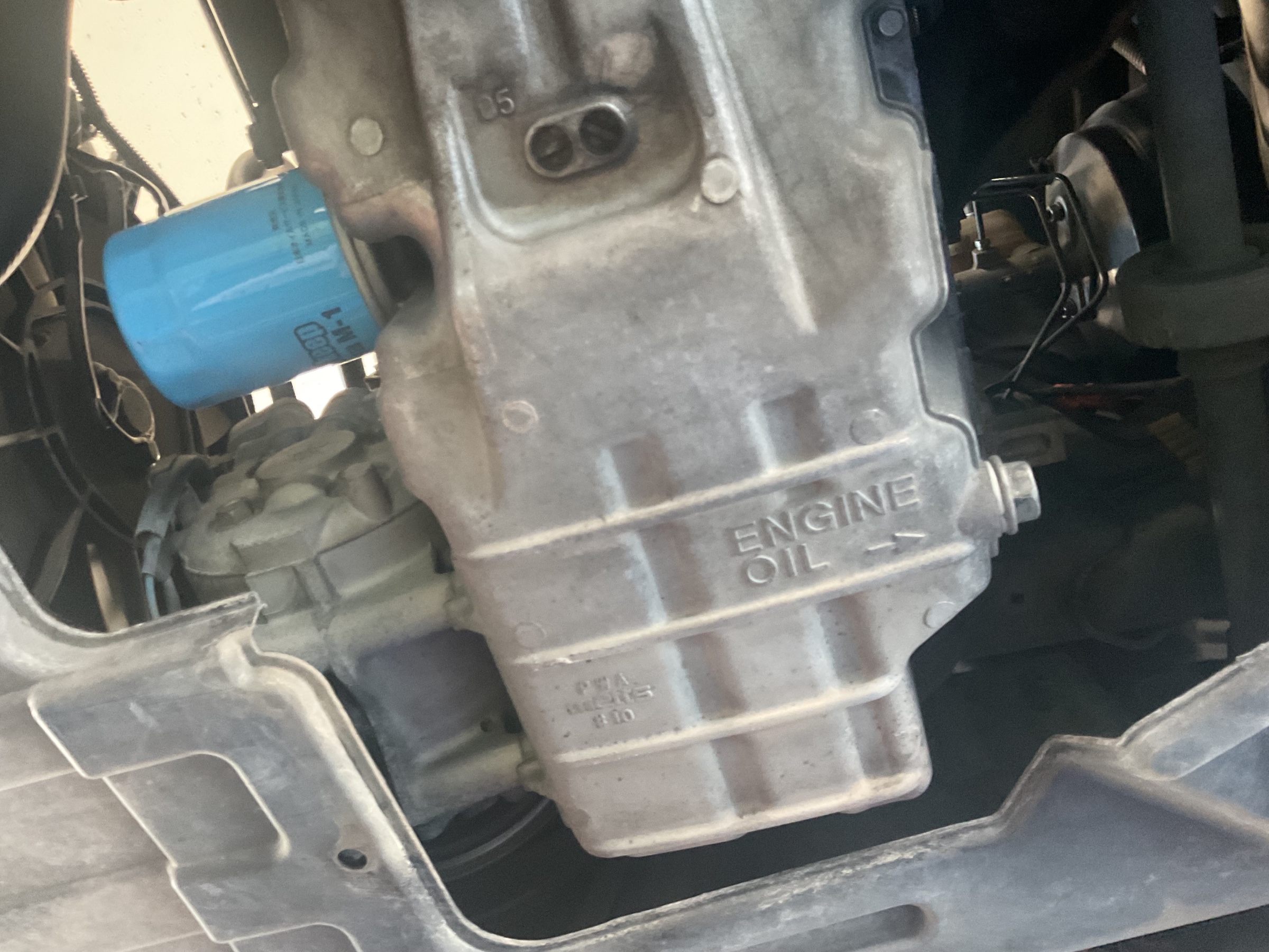 エンジンオイルパンの下のドレーンボルトを抜き、