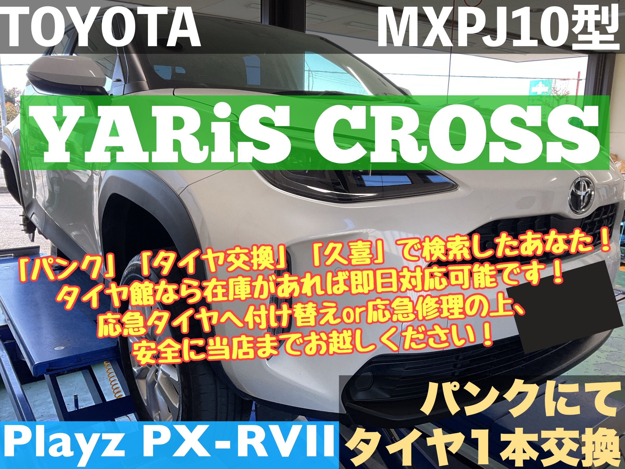 【トヨタ ヤリスクロス MXPJ10型】「パンク」「タイヤ交換」「久喜」で検索したあなた!タイヤ館なら在庫があれば即日対応可能です!応急タイヤへ付け替えor応急修理の上、安全に当店までお越しください!Playz PX-RVII【パンクにてタイヤ1本交換】★久喜市・加須市・白岡市・菖蒲・鷲宮・幸手・蓮田・予約★