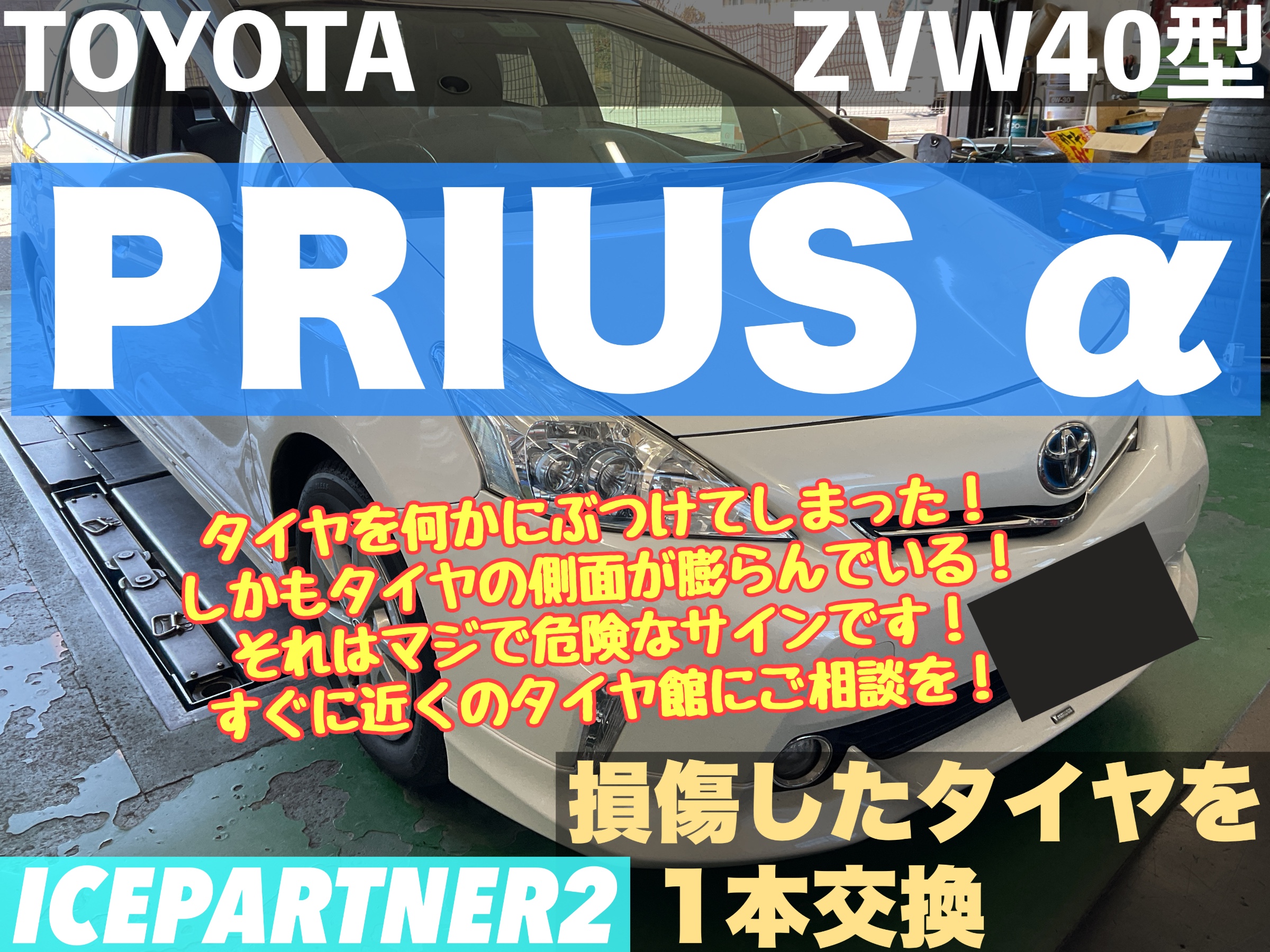 【トヨタ プリウスα ZVW40型】タイヤを何かにぶつけてしまった!しかもタイヤの側面が膨らんでいる!それはマジで危険なサインです!すぐに近くのタイヤ館にご相談を!ICEPARTNER2【損傷したタイヤを1本交換】★久喜市・加須市・白岡市・菖蒲・鷲宮・幸手・蓮田・予約★