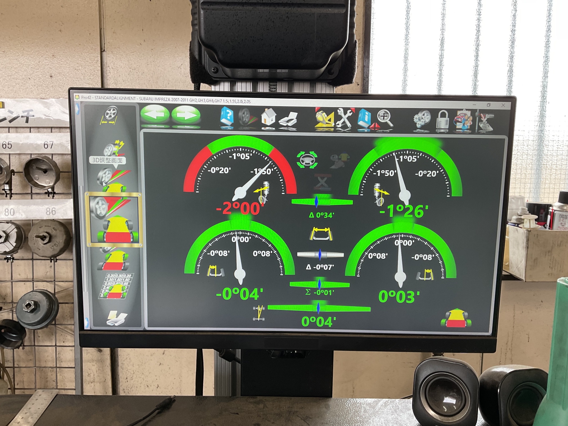 前後のトー角度の数値が左右同じになり、少なくとも直進安定性は改善し、