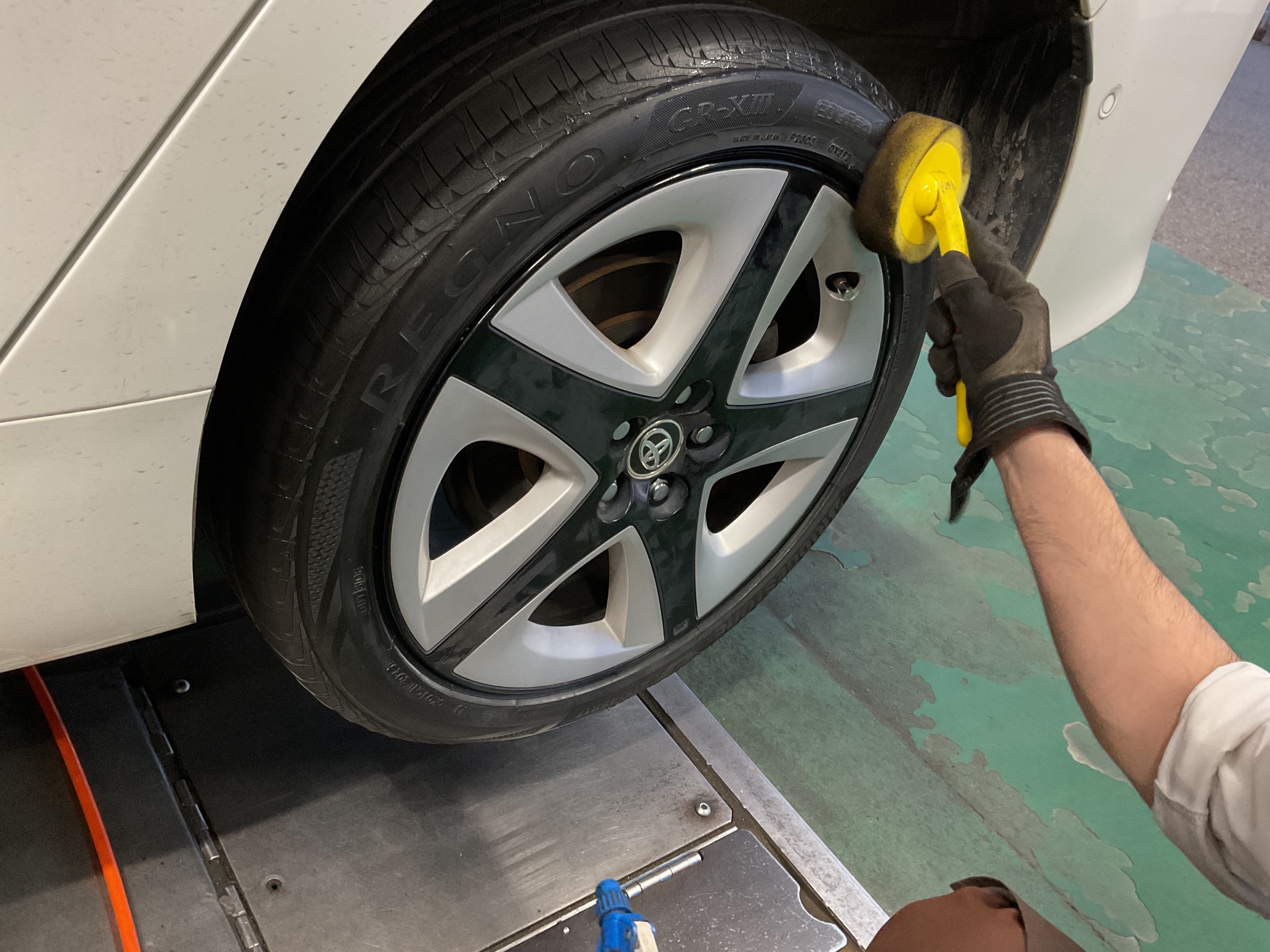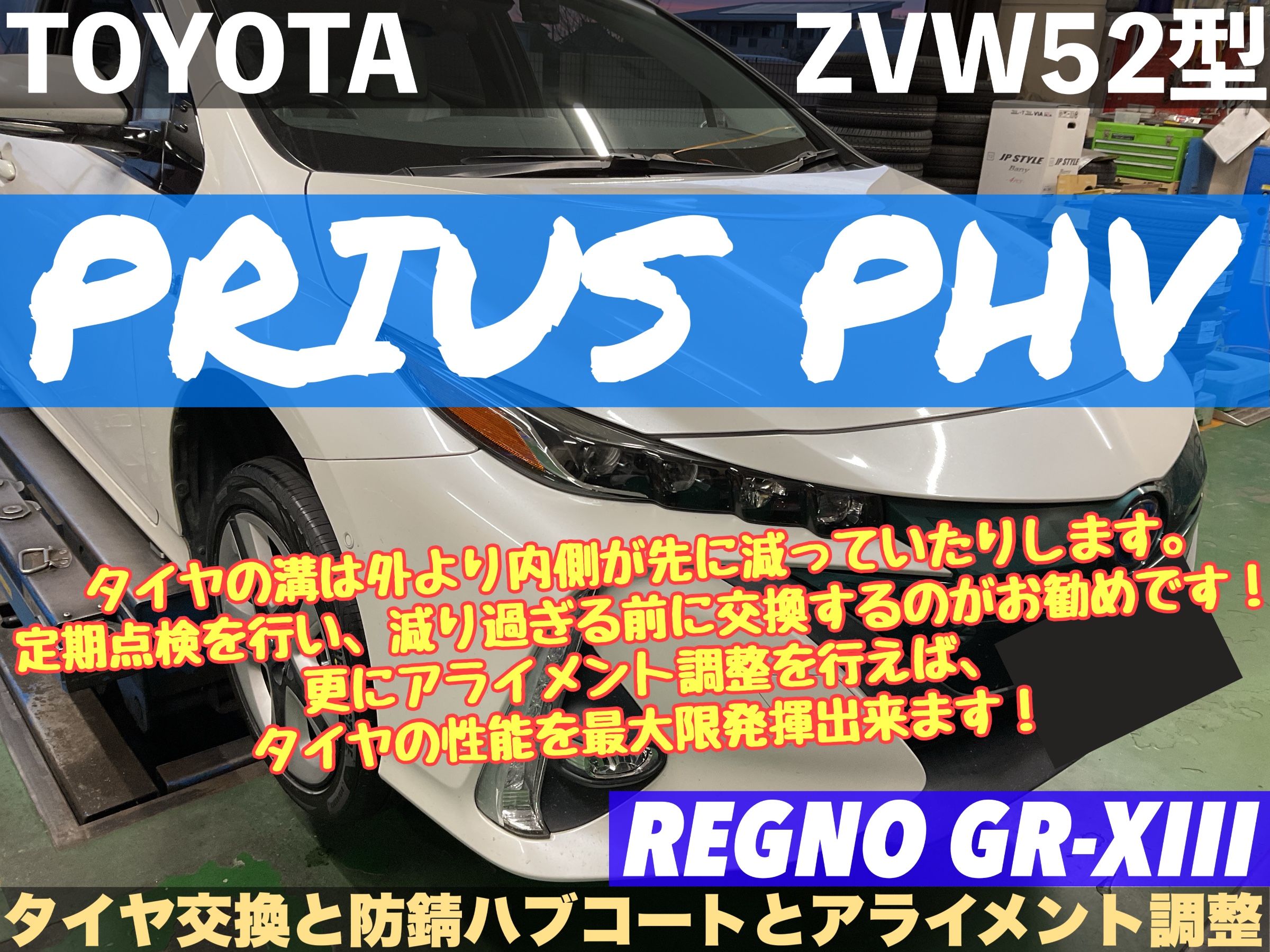 【トヨタ プリウスPHV ZVW52型】タイヤの溝は外より内側が先に減っていたりします。定期点検を行い、減り過ぎる前に交換するのがお勧めです!更にアライメント調整を行えばタイヤの性能を最大限発揮出来ます!REGNO GR-XIII【タイヤ交換と防錆ハブコートとアライメント調整】★久喜市・白岡市・菖蒲・加須市・鷲宮・幸手・蓮田・予約★