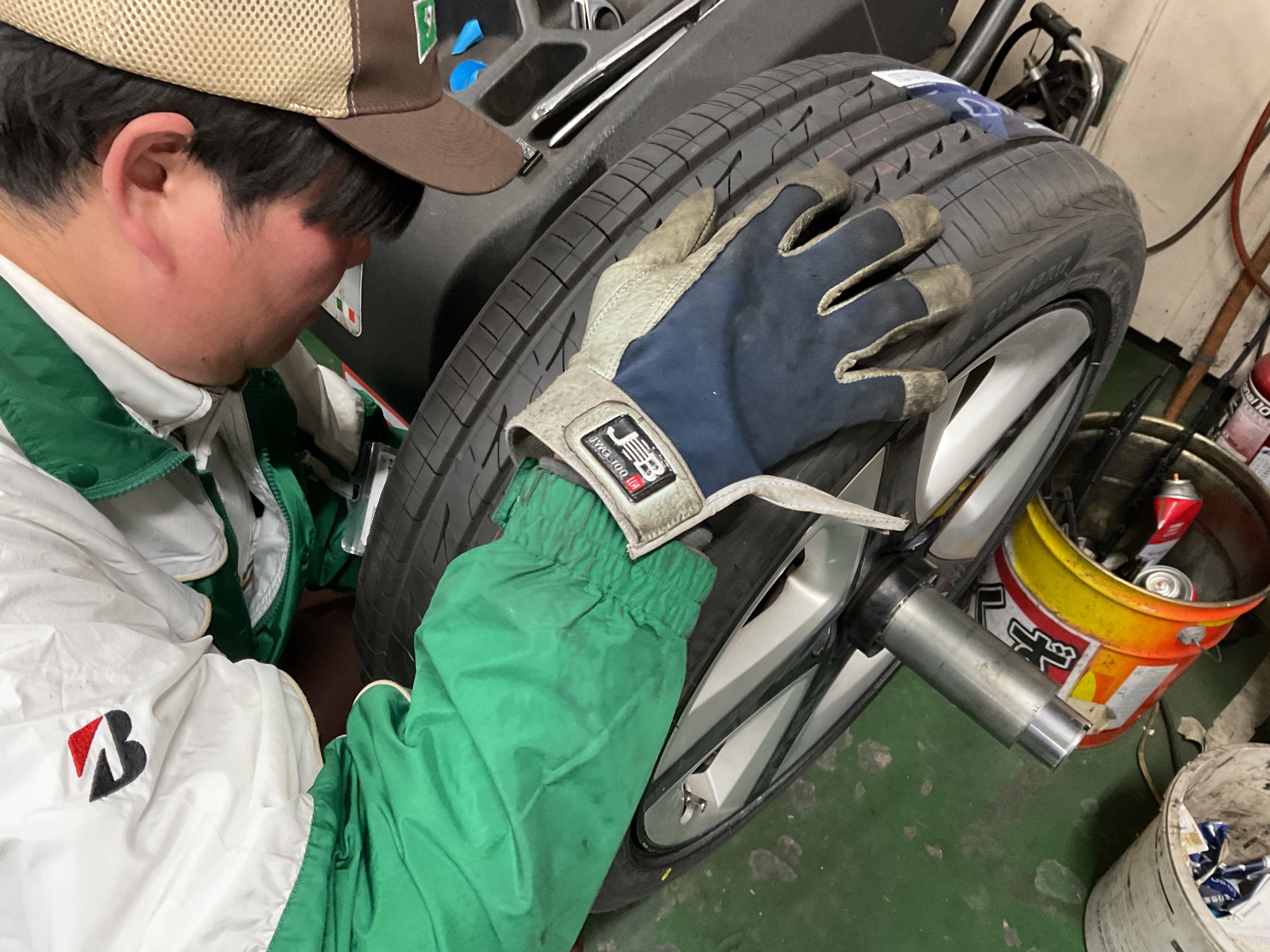 作業はタイヤ交換、窒素ガス充填、ホイールバランス調整の順に行います。