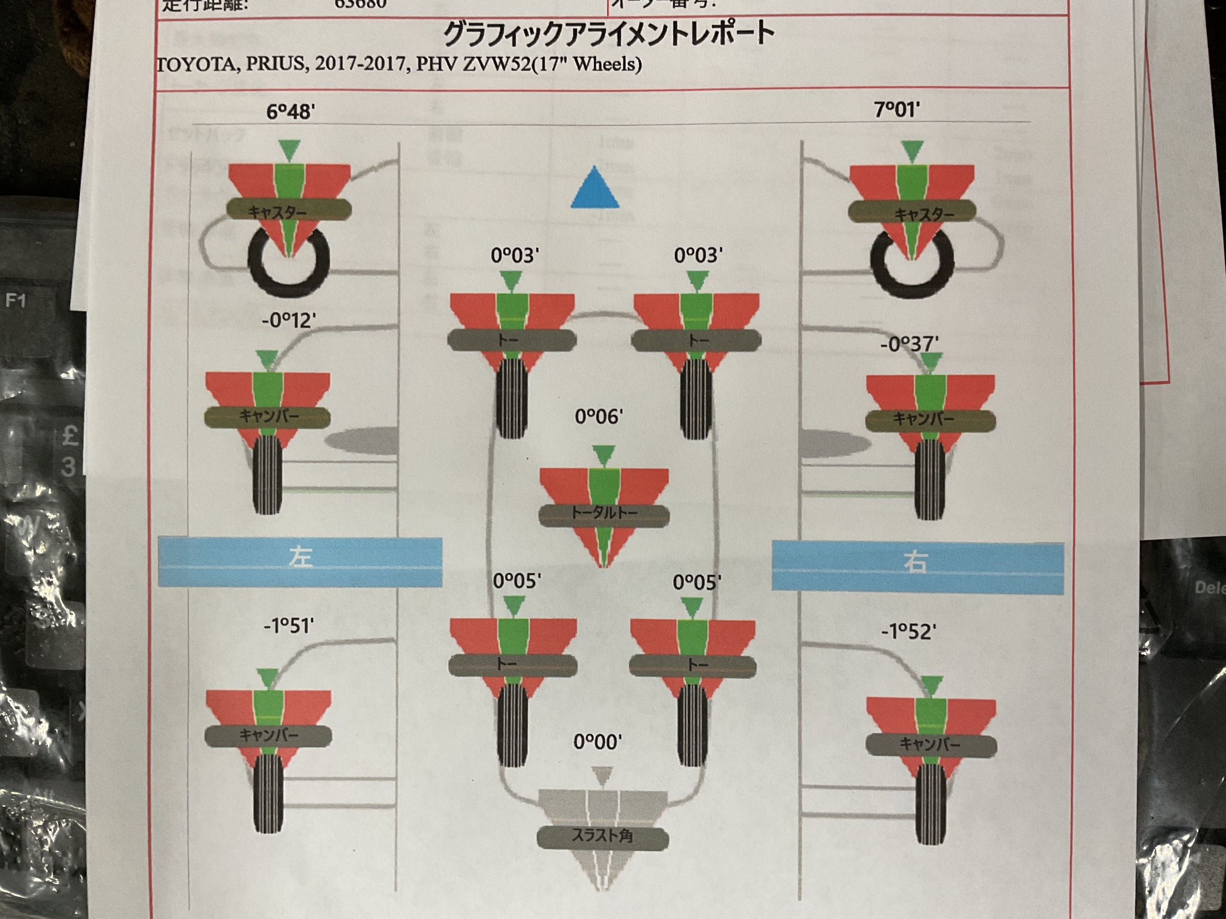 測定結果を見ると前のトー角度(進行方向への角度)は