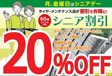 【毎週月曜・金曜の営業日に開催中!】 ★シニアデー でタイヤ・エンジンオイル・メンテナンス品をお得に交換!【元気なシニアドライバーをサポートします!】★久喜市・白岡市・菖蒲・加須市・鷲宮・幸手・蓮田・予約★