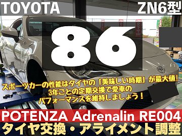【トヨタ 86 ZN6型】スポーツカーの性能はタイヤの「美味しい時期」が最大値。3年ごとの定期交換で愛車のパフォーマンスを維持しましょう!POTENZA Adrenalin RE004【タイヤ交換とアライメント調整】★久喜市・白岡市・菖蒲・加須市・鷲宮・幸手・蓮田・予約★