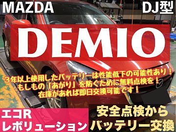【マツダ デミオ DJ型】3年以上 使用した バッテリー は 性能低下 の可能性あり!もしもの「あがり」を防ぐために 無料点検 を!在庫があれば 即日交換 可能 です!GSユアサ エコアールレボリューション【安全点検からバッテリー交換】★久喜市・加須市・白岡市・菖蒲・鷲宮・幸手・蓮田・予約★