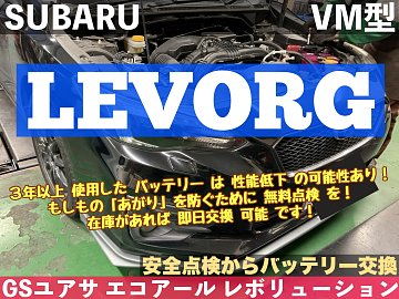 【スバル レヴォーグ VM型】3年以上 使用した バッテリー は 性能低下 の可能性あり!もしもの「あがり」を防ぐために 無料点検 を!在庫があれば 即日交換 可能 です!GSユアサ エコアールレボリューション【安全点検からバッテリー交換】★久喜市・加須市・白岡市・菖蒲・鷲宮・幸手・蓮田・予約★