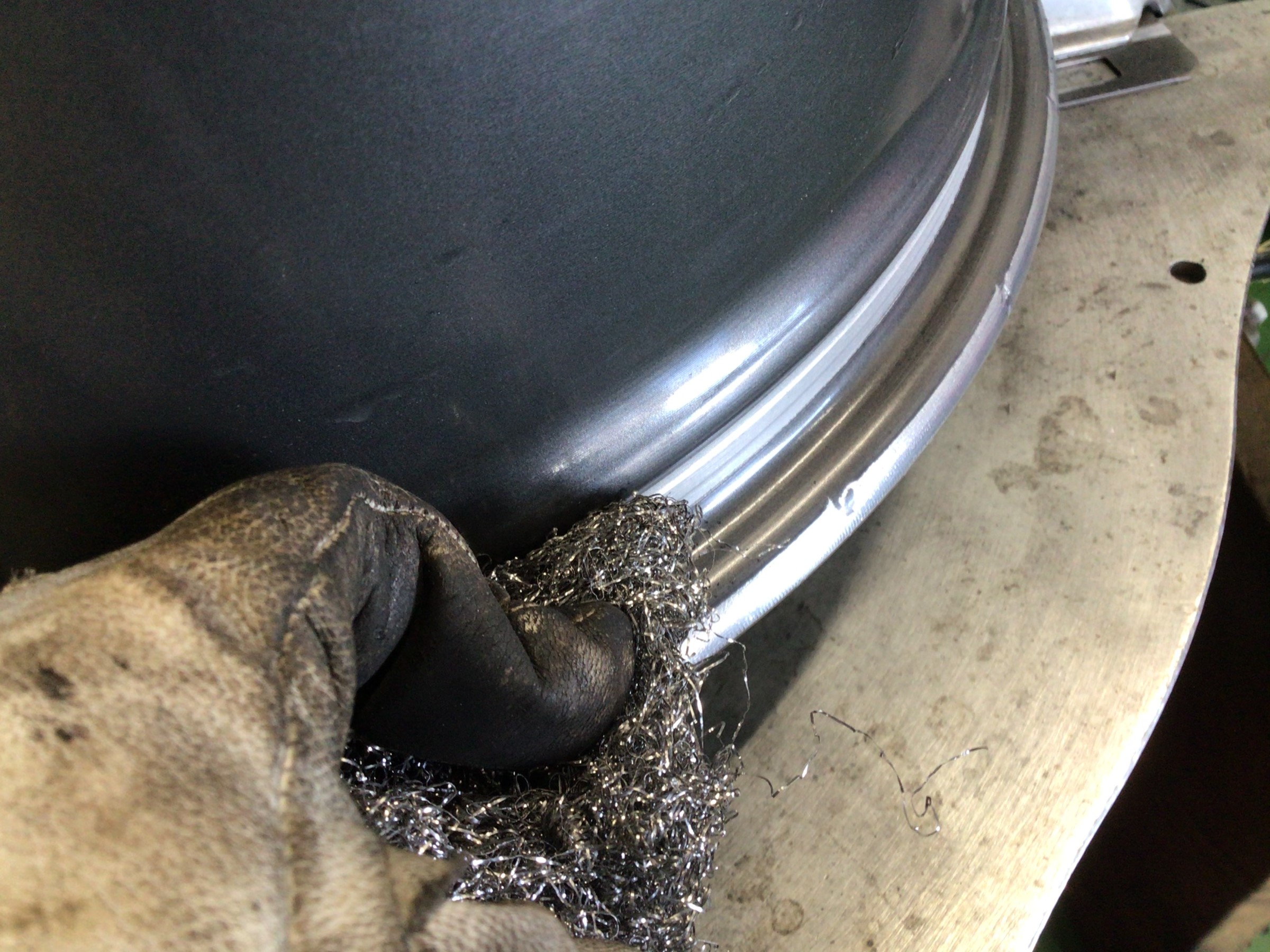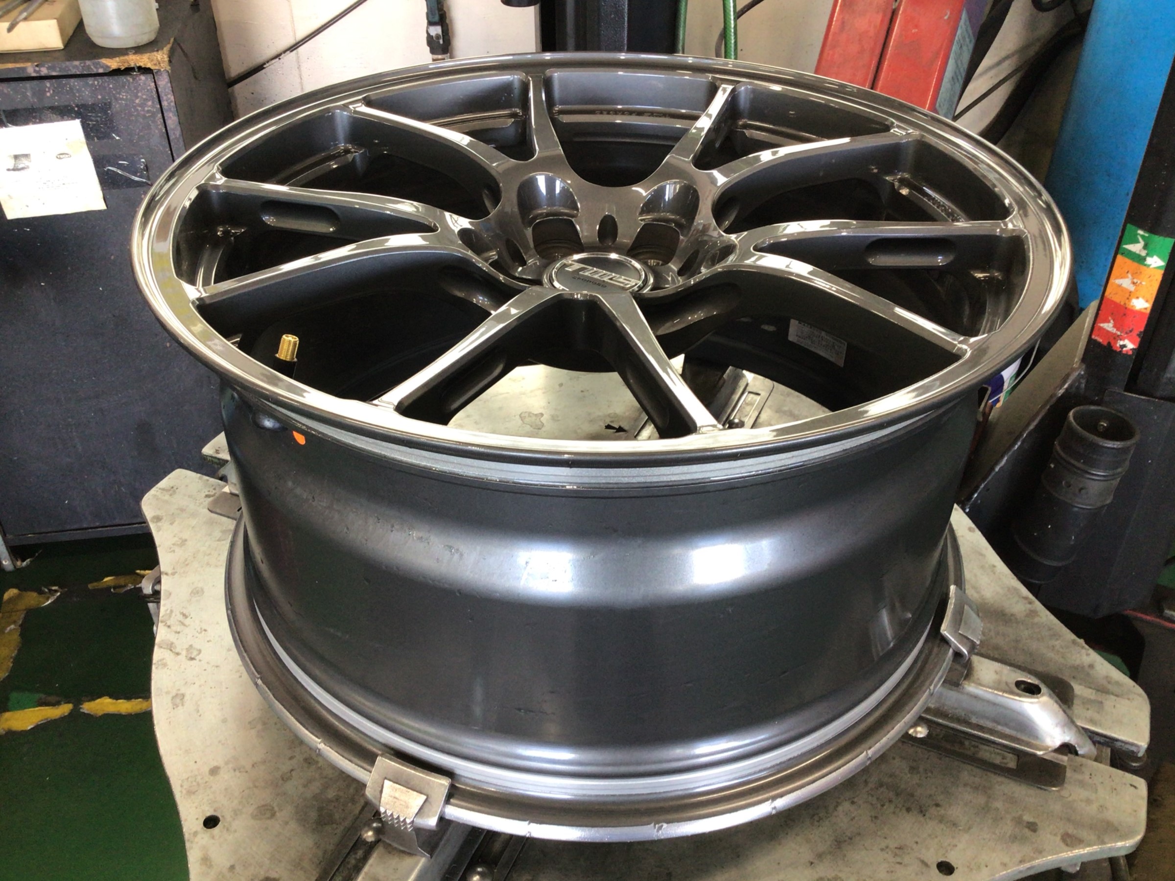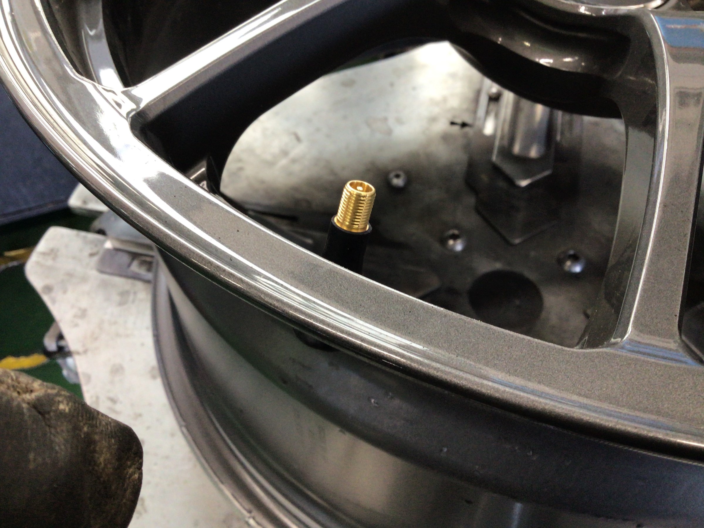 新しいタイヤを組み込む前にゴムの汚れなどをキレイに削り落としてエアーバルブも交換(*´з`)