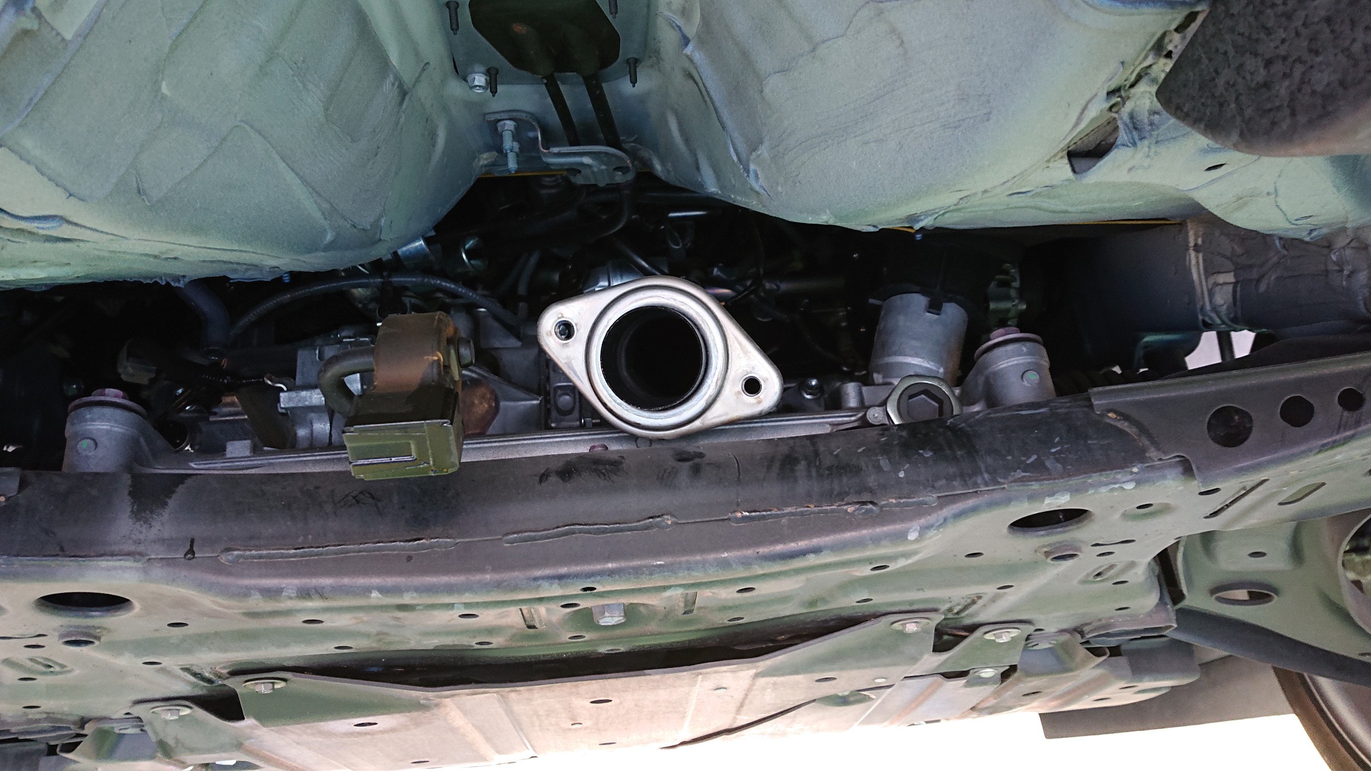 今回は写真の部分のフロントパイプと中間パイプの間にある純正の球面ガスケットを新品に交換します!