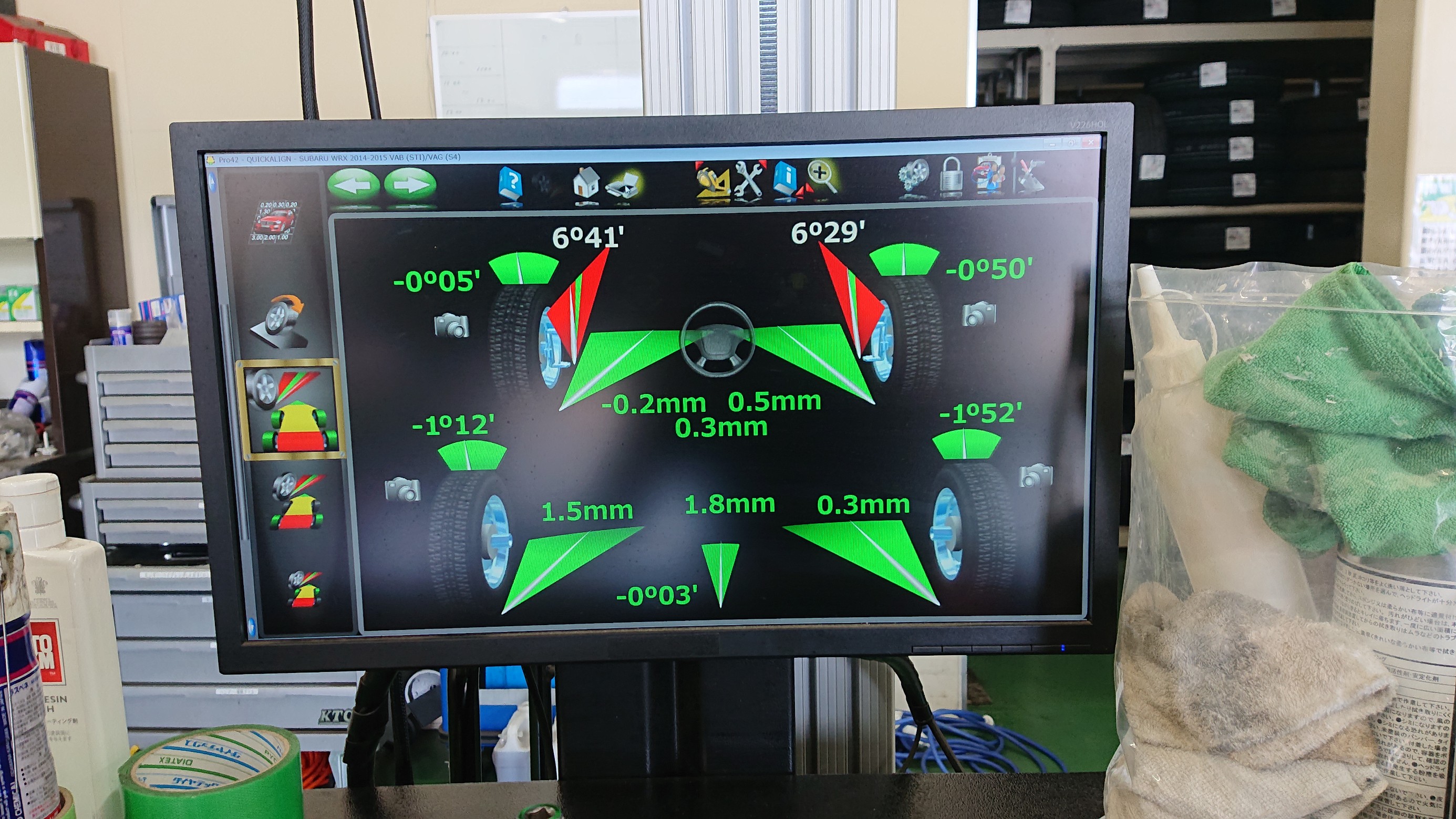 キャンバー:左右とも基準値よりも少しタイヤの角度が起きすぎている状態です!