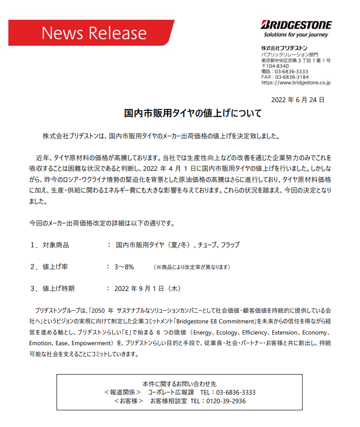 「タイヤの値上げ」に付いて発表がありました