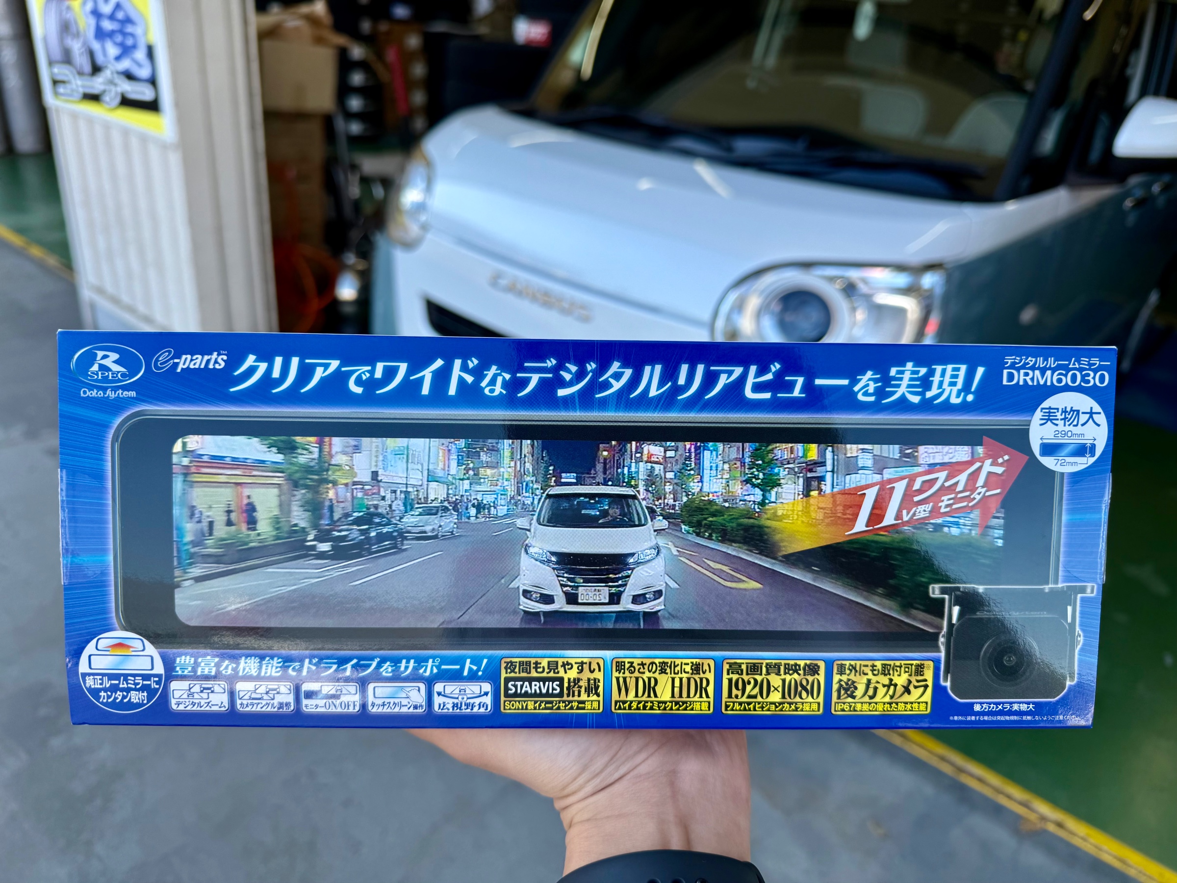ルームミラーのデジタルインナーミラー化もタイヤ館にお任せ!ダイハツ ムーヴキャンバス(LA850S)にデータシステム「デジタルルームミラーDRM6030」取り付け!