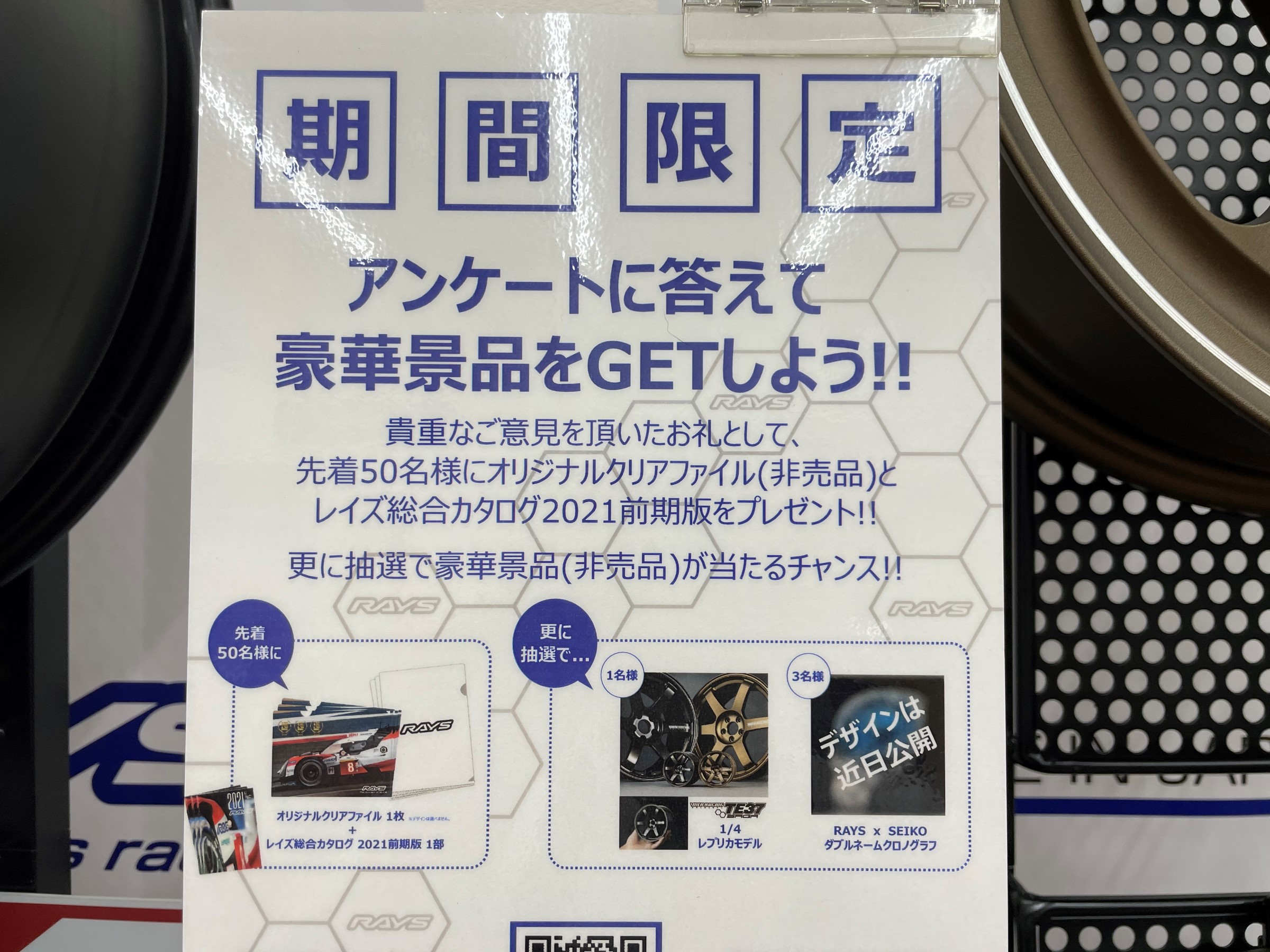 2月20日~2月23日にタイヤ館倉敷大島店限定でアンケートに答えていただくと先着50名にRAYSオリジナルクリアファイル(非売品)とRAYSカタログをプレゼントしてます!!さらに抽選で豪華景品(非売品)が当たるチャンスも!!