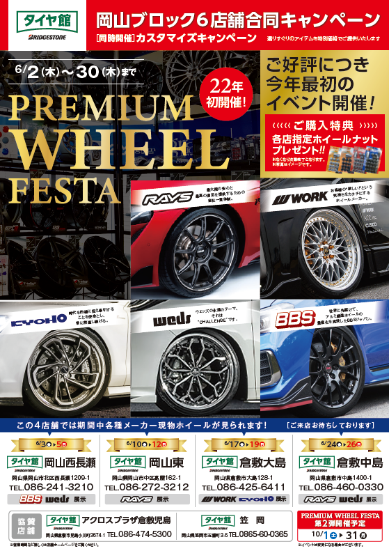 6月はアルミホイールキャンペーン開催!! ポスト 2022年5月29日 いつもタイヤ館倉敷大島店のWEBのご観覧 誠にありがとうございます♪ 6月は岡山地区のタイヤ館6店舗合同で アルミフェアを開催します!! 普段は見られない現物ホイールも多数展示します♪ この機会にお気軽にお立ち寄りください! タイヤホイールのことなら タイヤ館倉敷大島店へお任せください♪ 皆様もご来店心よりお待ちしております! タイヤ館倉敷大島 〒710-0047 倉敷市大島128-1 TEL:086-425-6411 担当:田村