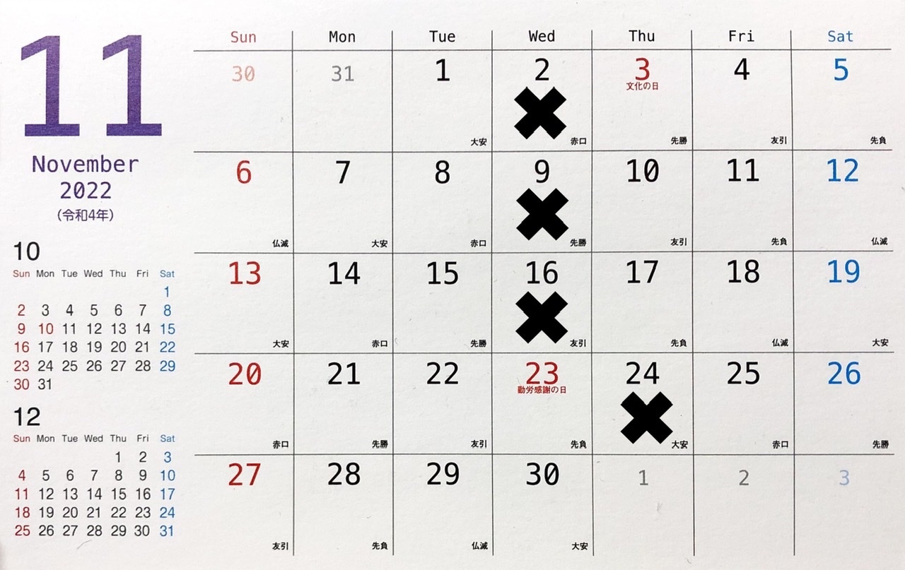さて11月の定休日ですが11月はいつも通りの