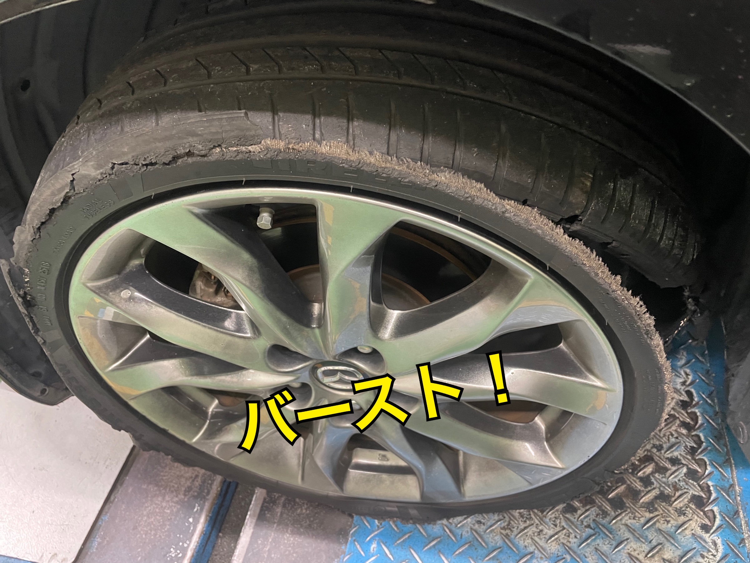 先日JAFから、タイヤがバーストしたお車が来られました。