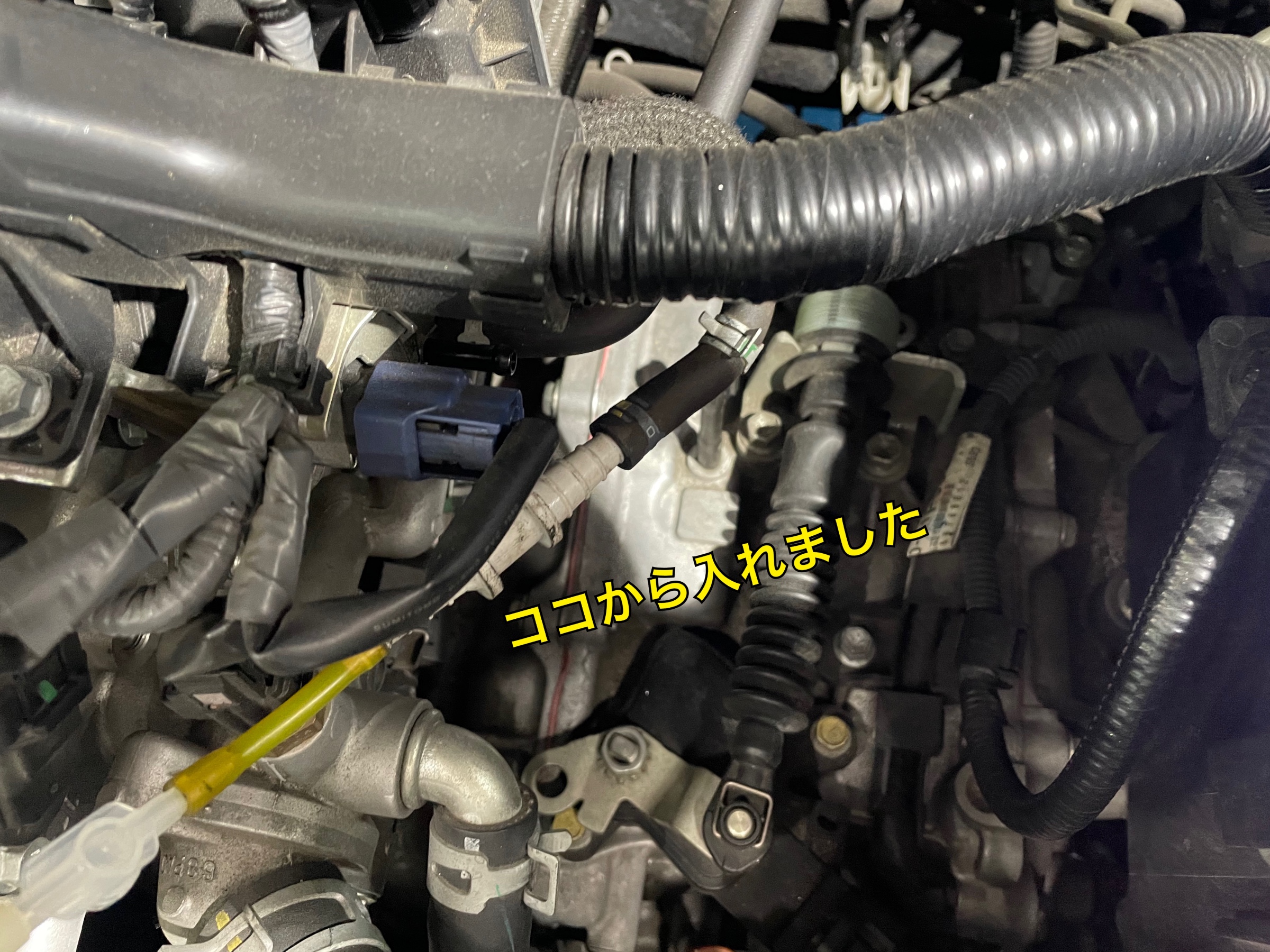 まずは薬剤をエンジンに流し込むためにホースがさせる所を探します。