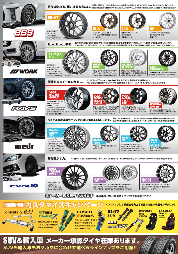 メーカーはRAYS・WORK・ wedsに加えて当店限定でBBSも追加で展示いたします!