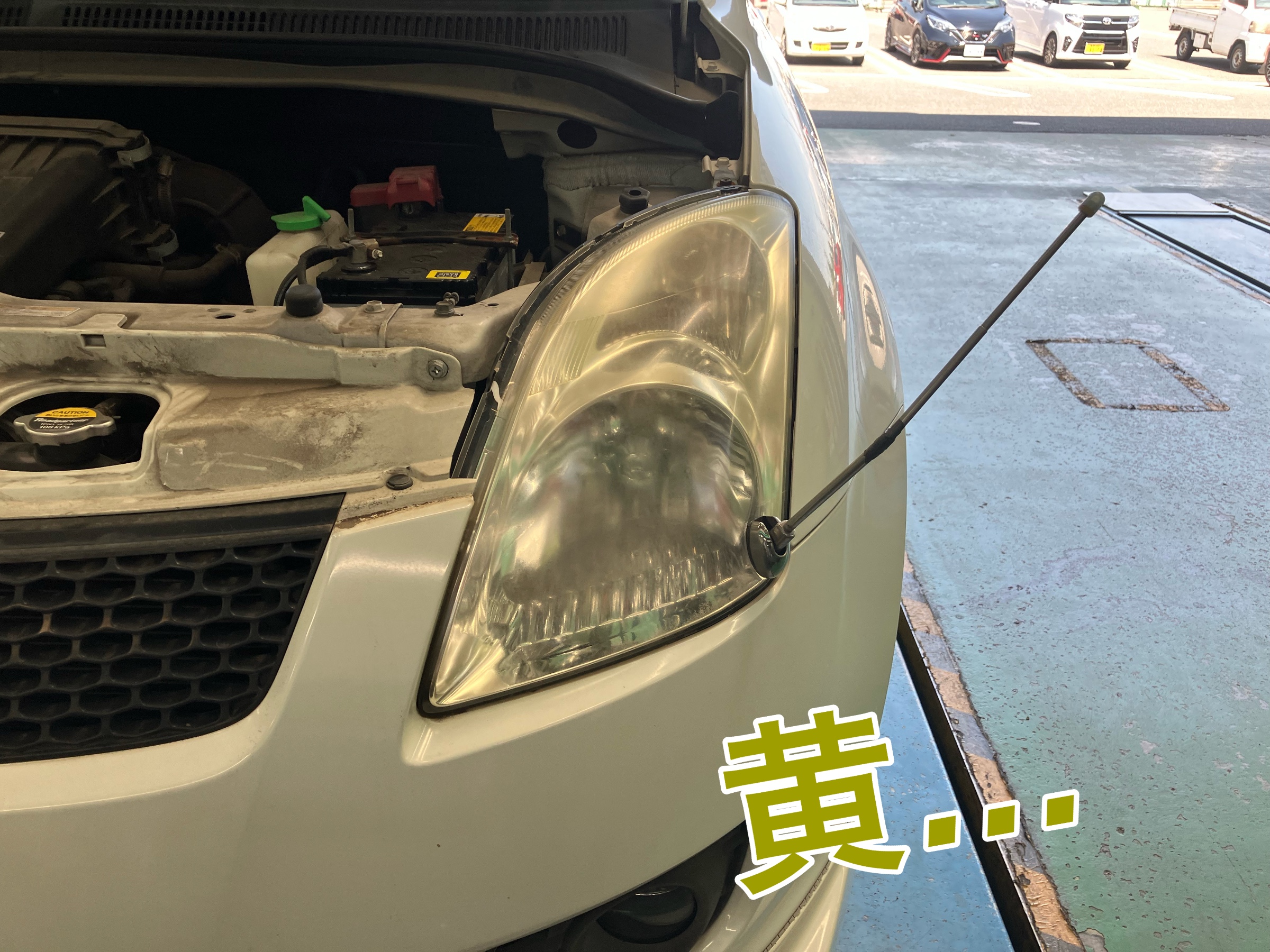 太陽光やヘッドライトからの熱でプラスチックが痛み、だんだんと黄ばんでしまうのです。