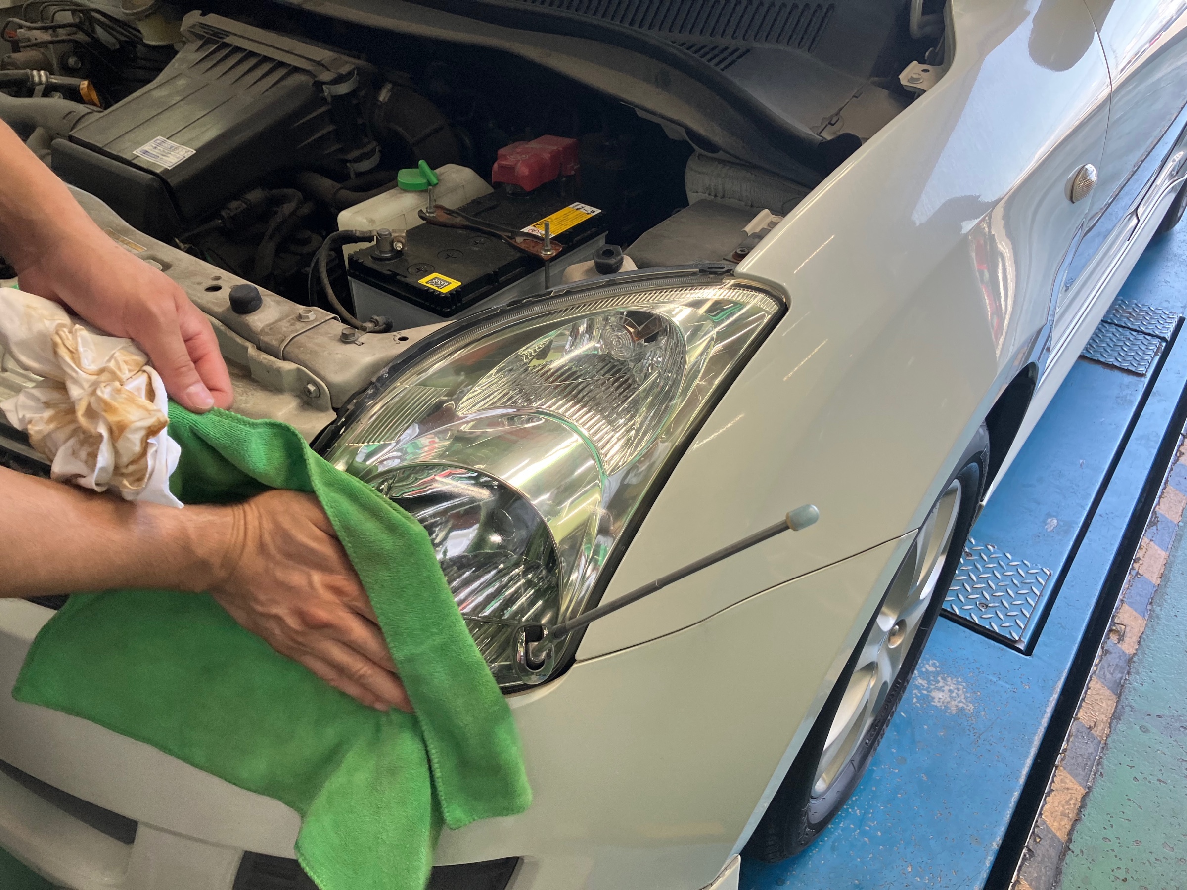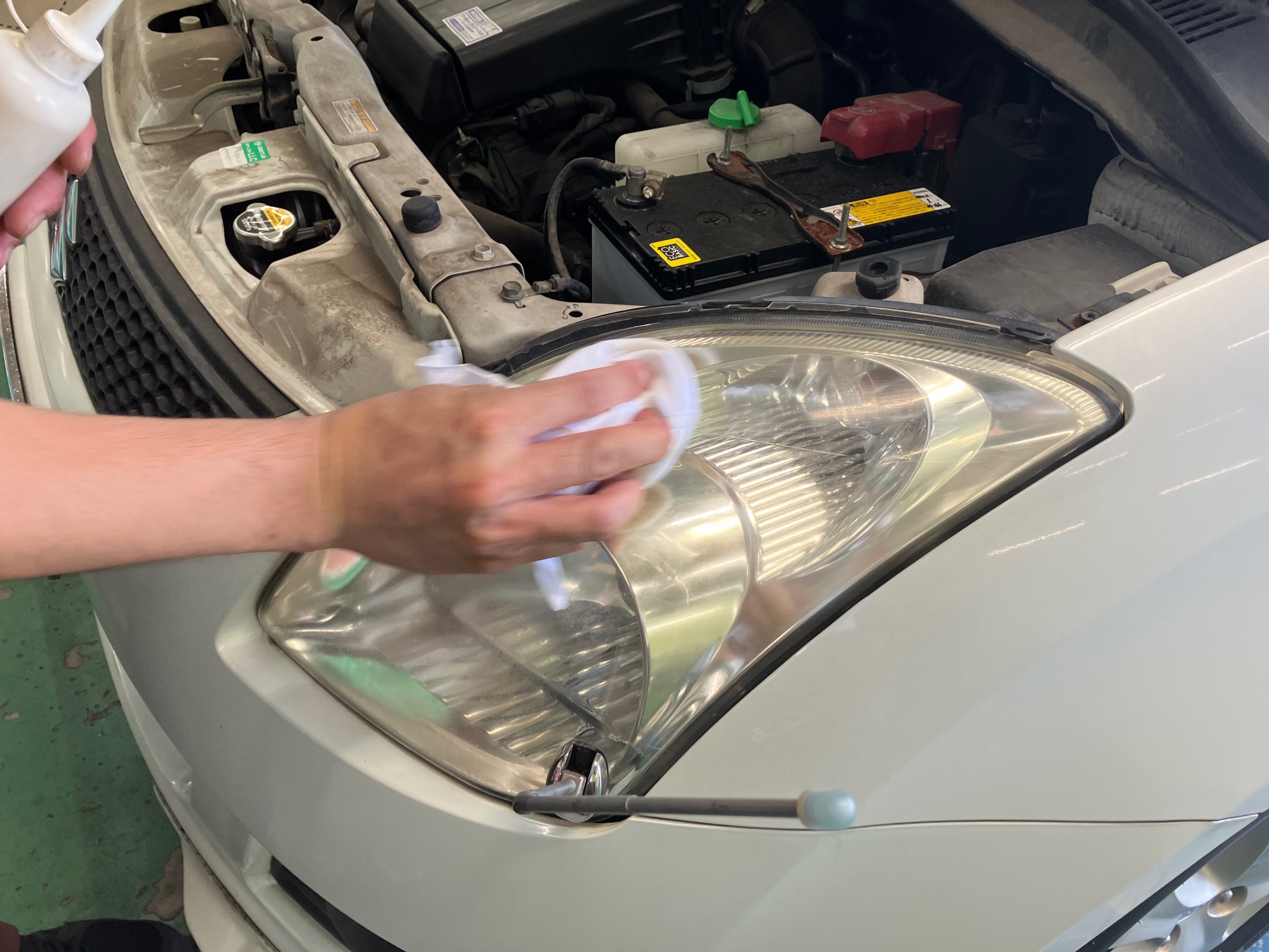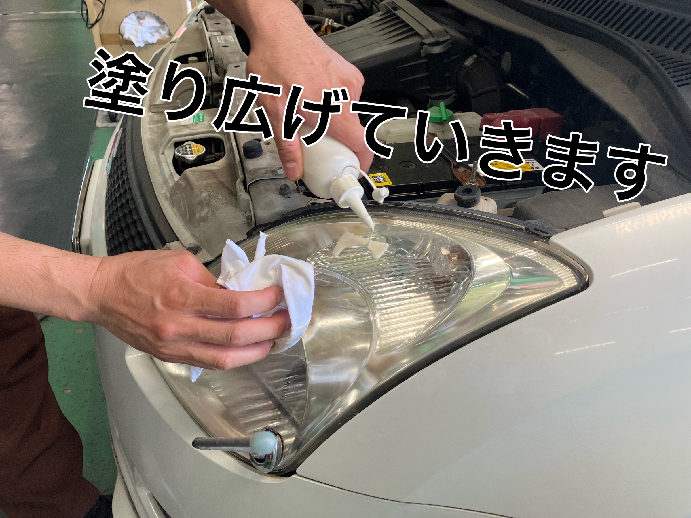 まずは溶剤をヘッドライトに塗り広げていきます!